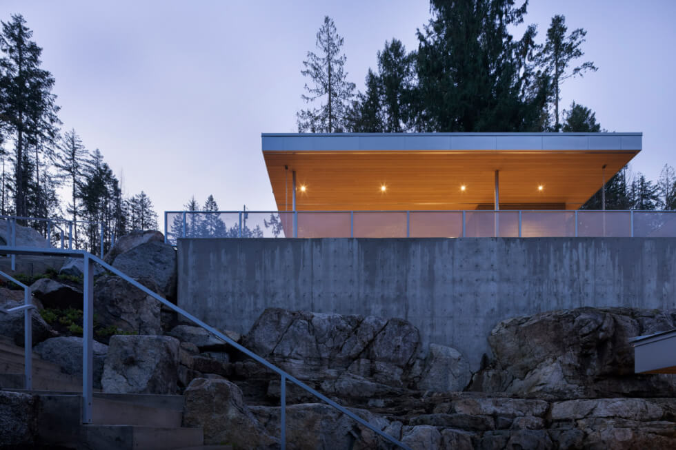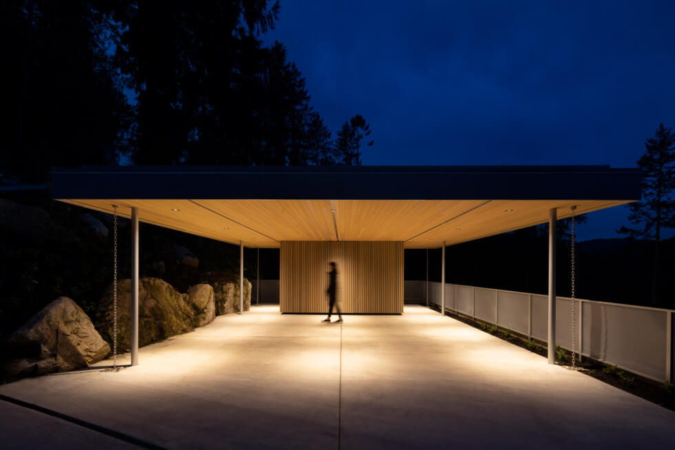 Meanwhile, the soffits, ceilings, and walls within use hemlock. Floor-to-ceiling glass walls are a great addition to maximize natural lighting. The top roof overhang provides adequate shade as well. A detached carport is the point of arrival for the Sakinaw Lake House. Outdoor stairs descend to the main entrance on the top floor.