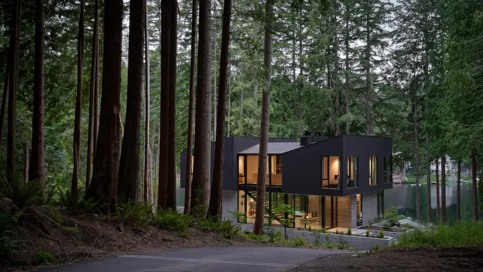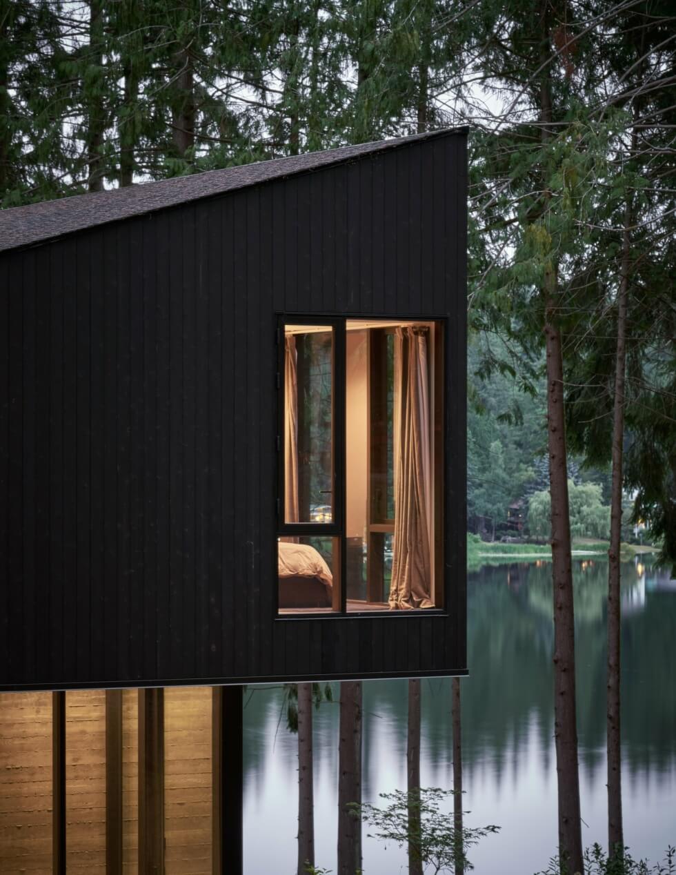 The ground floor of Scout Lake hosts the communal spaces including the open living room, kitchen, and dining room which opens out to the outdoors. It also hosts an office and a guest room. Meanwhile, charred shou sugi ban from local cider clads the 16-foot cantilevered upper floor that extends past the first floor. The extension gives room for private spaces including a family room, three bedrooms, and a laundry room that’s connected via a suspended bridge.