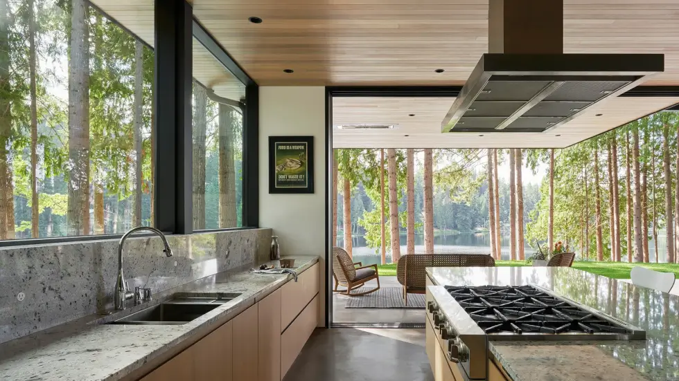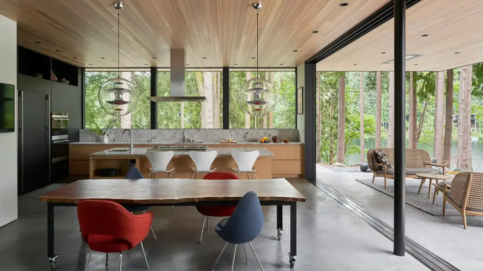 This magnificent glass house also has a basement that hosts a media room, a glass-walled wine cellar, and a home gym. Amazing views of the forest and the lake is made possible via glazing and massive glass sliding doors. Built-ins are also embedded into almost every nook inside Scout Lake, including a walnut Murphy bed in the guest room that complements a Finn Juhl sideboard. Lighting designers also made sure to maintain a Danish sensibility for low light and shadow light to evoke the ambiance of a candlelit room or a campfire at dusk.