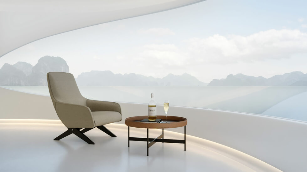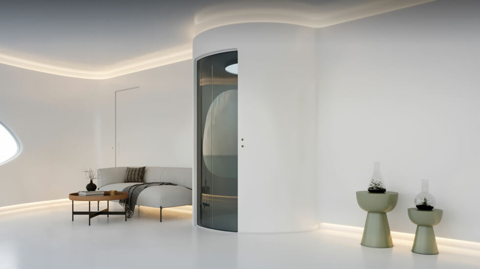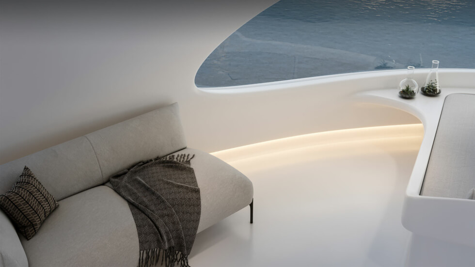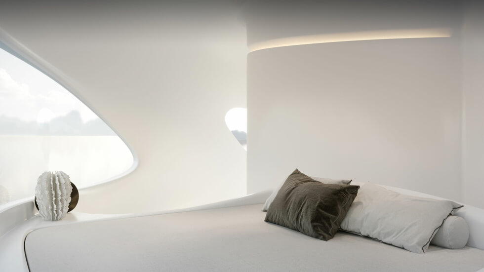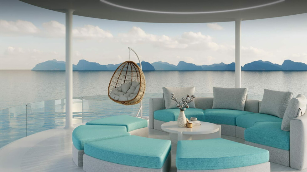 Steel, concrete, fiberglass, foam, and gel coat comprise its construction. 360-degree views of the surrounding seascape are possible with 578.45 square feet of panoramic glazing. There’s a living room, master bedroom, kitchen, bathroom, balcony, and more. Guests or owners wear a smart ring to unlock doors and activate various functions around the SeaPod.