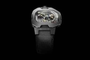 URWERK ships the UR-120 with a black calfskin leather strap that sports a synthetic fiber-like embossed pattern on the topside.