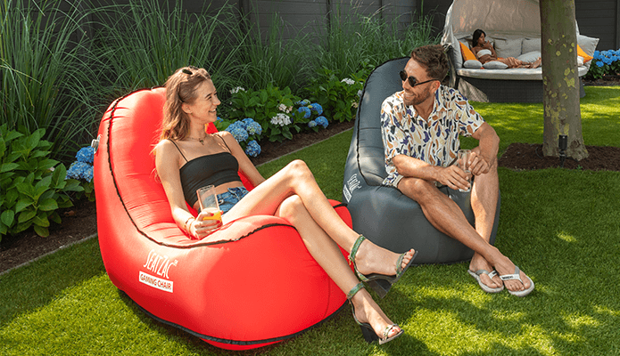 As with other inflatable chairs, the SEATZAC Self-Inflatable Chair folds down to make it portable. It comes with its carrying bag and is lightweight at just 920 grams. It even comes in bright colors and in two designs: the E-Zy and the E-Zy lounger/gaming chair.