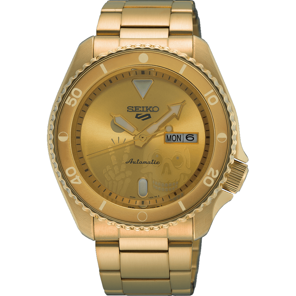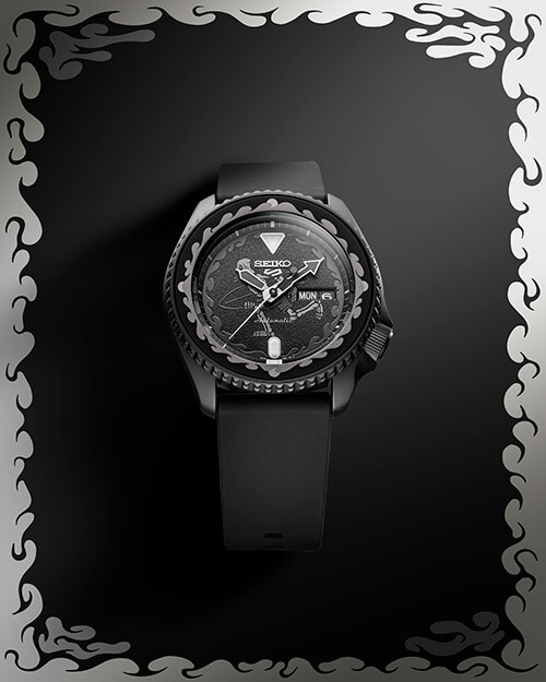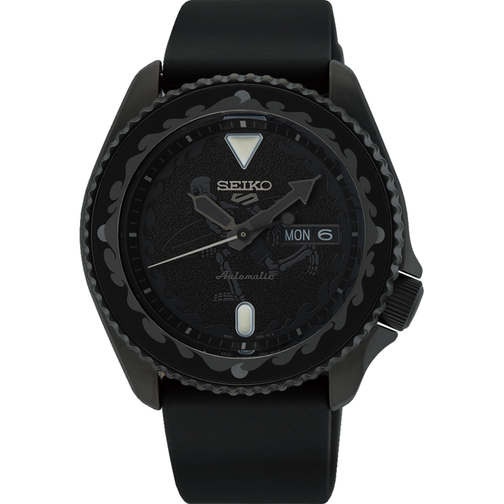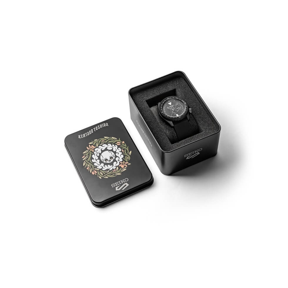 Meanwhile, timekeeping functions are handled by an in-house Calibre 4R36 movement. The self-winding mechanical system boasts a 41-hour power reserve and a day/date aperture at 3 o’clock. Among the trio, most of us here will pick reference SRPL25K. Out of the bunch, this is the blackout option courtesy of its PVD coat. The dial is adorned with the artist’s signature skeleton motif. It also ships with a black rubber strap.