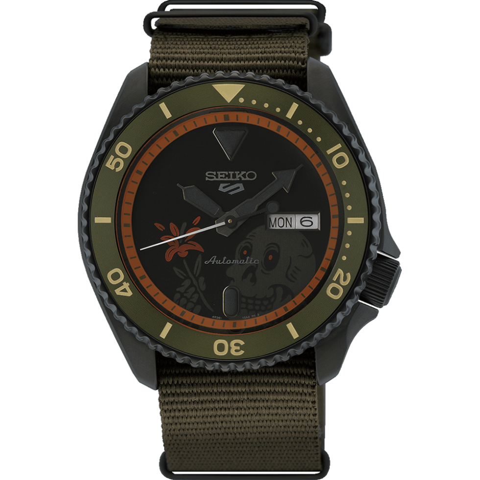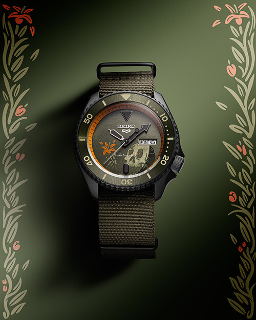 Next on the list is SRPL26K. Seiko is presenting the case, as well as the stainless steel bracelet in yellow gold. In addition to its vibrant metallic finish, the dial shows a smiling skull forming a peace sign with its fingers. Finally, there’s the SRPL27K in an olive green theme alongside a Nylon NATO strap. The dial flaunts an image of a grinning skull holding a flower.