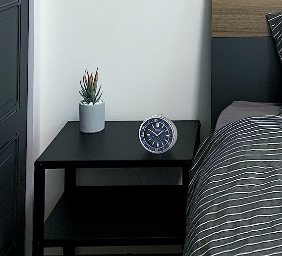 This clock runs on one AA battery (included in the box) and is just the right size to place on your bedside table or work desk at a size of 3.74″ H x 3.70″ L x 1.97″ W. It weighs just 2.2 kg. and is available in a variety of colors on its watch face including Metallic Green, blue, Black, Classic Black, Classic Blue, Metallic Blue, Silver, and Metallic Black & Gold.