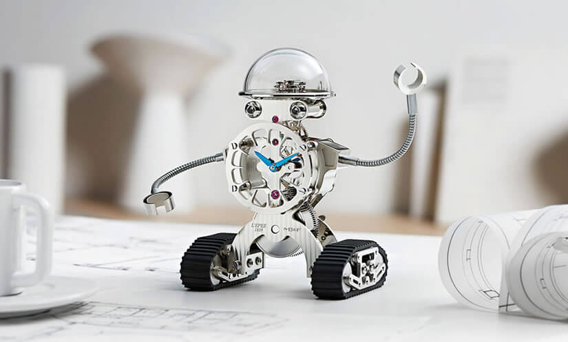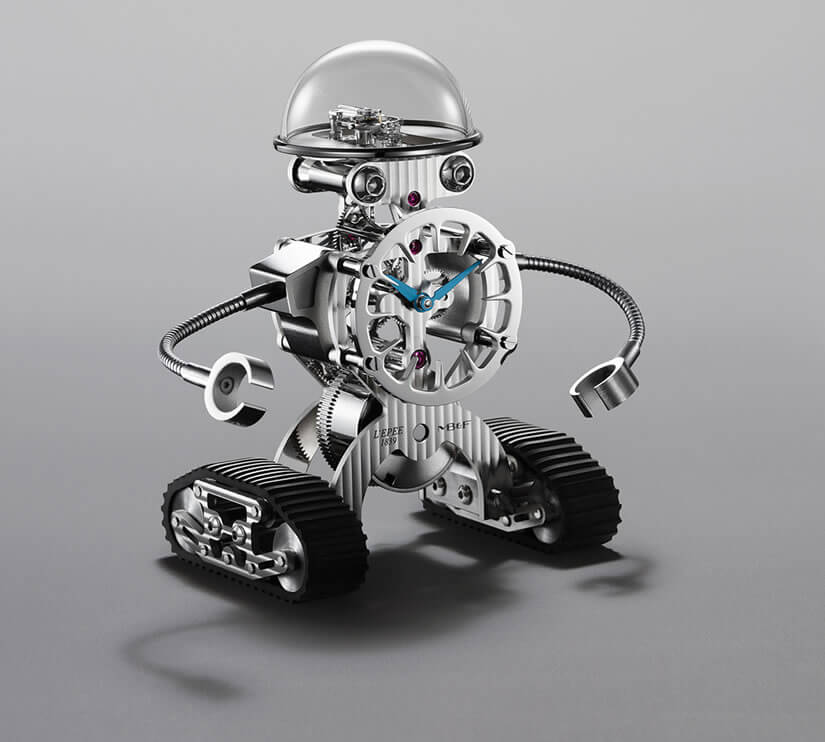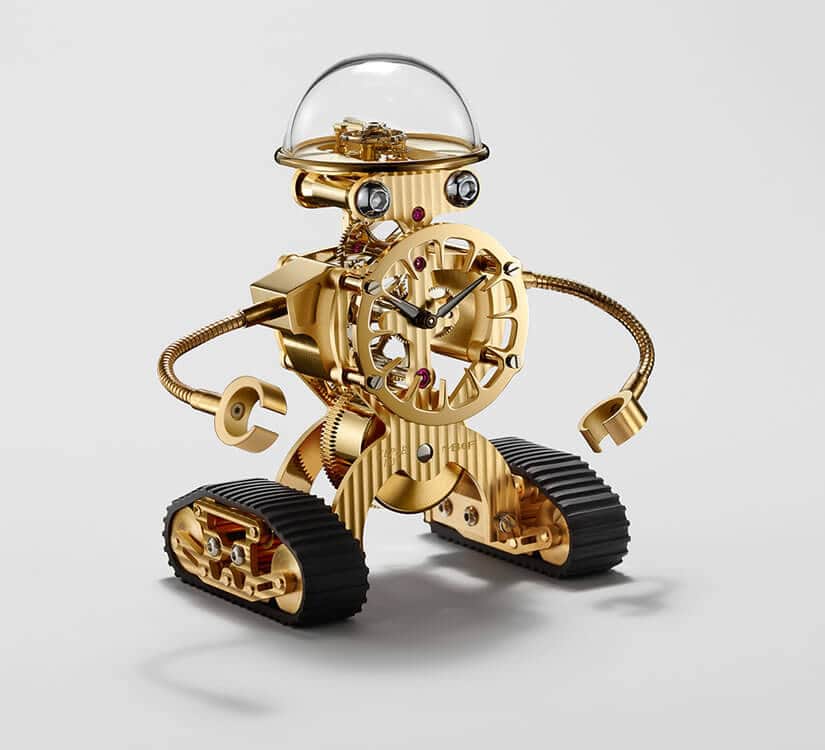 Time can be read off of his chest, his malleable hands can hold small objects, and his rubber caterpillar tracks are actually fully functional. More than just a cute little mechanical statue for your desk, Sherman is also a funny little character that is undoubtedly going to be a main conversation starter in your office. It is available with gold plating (200 pieces), palladium plating (200 pieces) and with gold and diamond detailing (50 pieces).