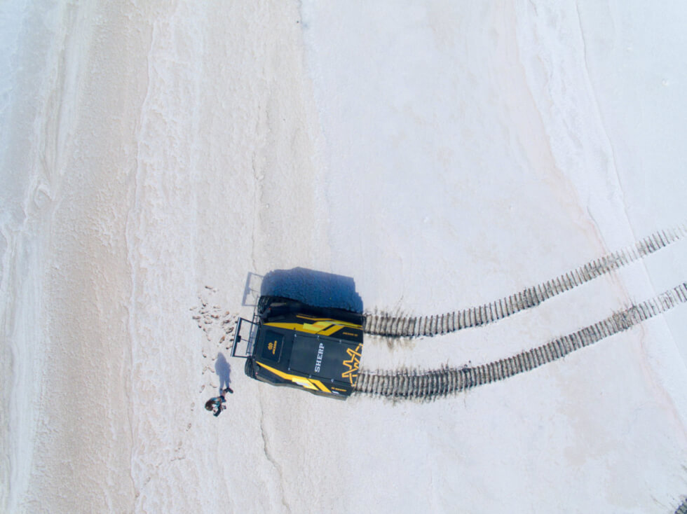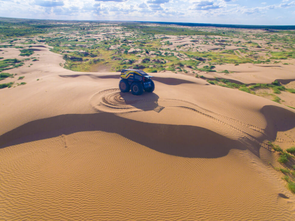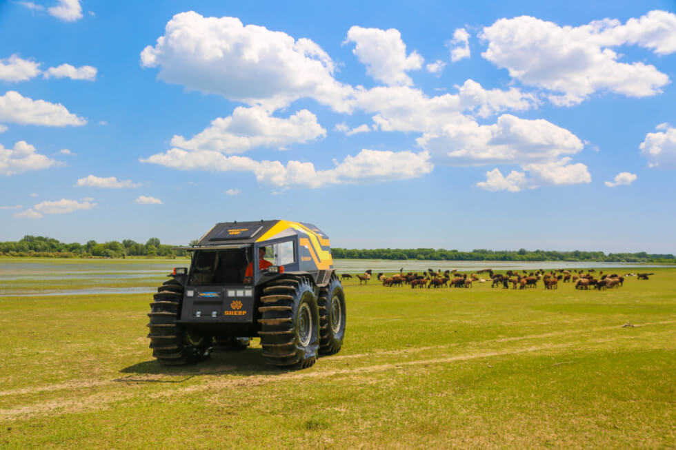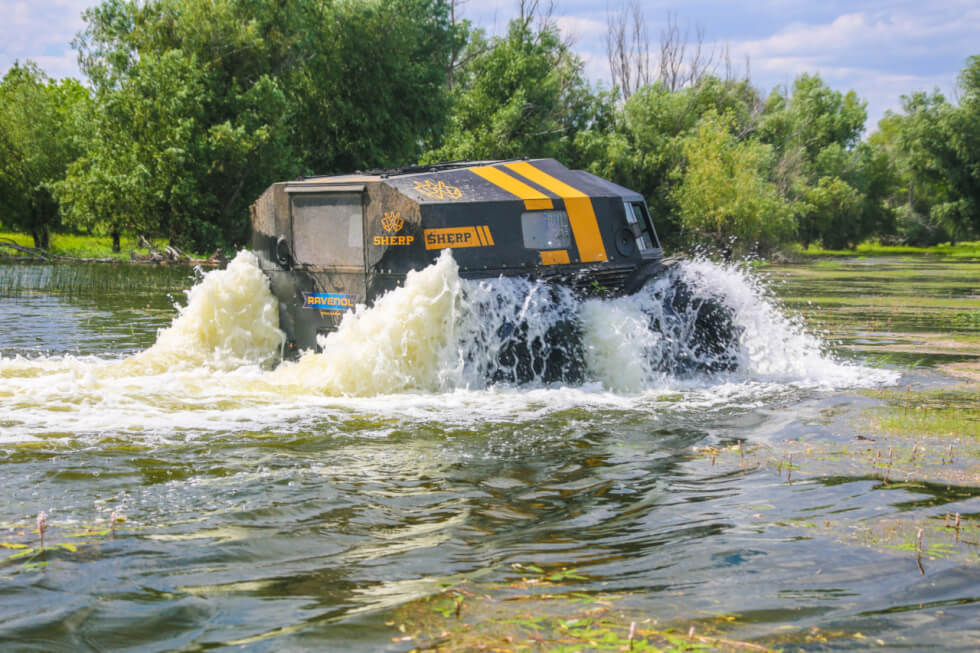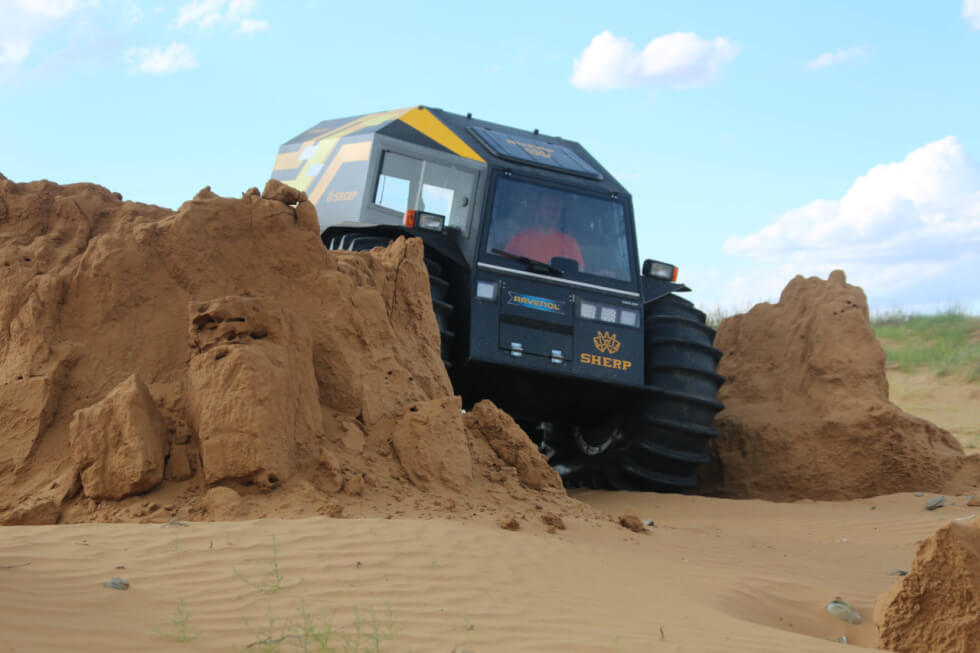 At first glance, it looks a little odd with the oversized set of tires flanking the body. However, it serves a clear purpose in all this madness. This setup gives the Sherp 23 inches of ground clearance. Moreover, the manufacturer reveals that the self-inflating rubber adds versatility to the ATV. Along with the pneumatic circulating suspension system, it can practically traverse on almost every surface imaginable.
