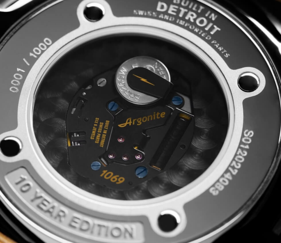 Meanwhile, the baton hour markers and spine of its leaf hands have been treated with a coat of Super-LumiNova for low-light visibility. Also, a small seconds counter is positioned at 6 o’clock with an orange pointer against a black and snailed sub-dial. To the right of the 10-Year Limited Edition Runwell is an antique-style crown, while the exhibition case back gives us a peek at the Detroit-built Argonite 1069 Quartz-analog movement.