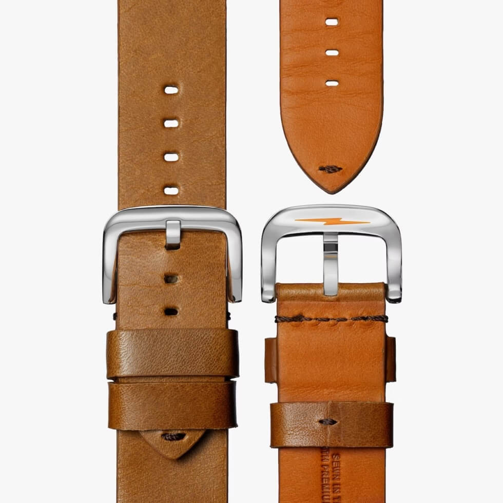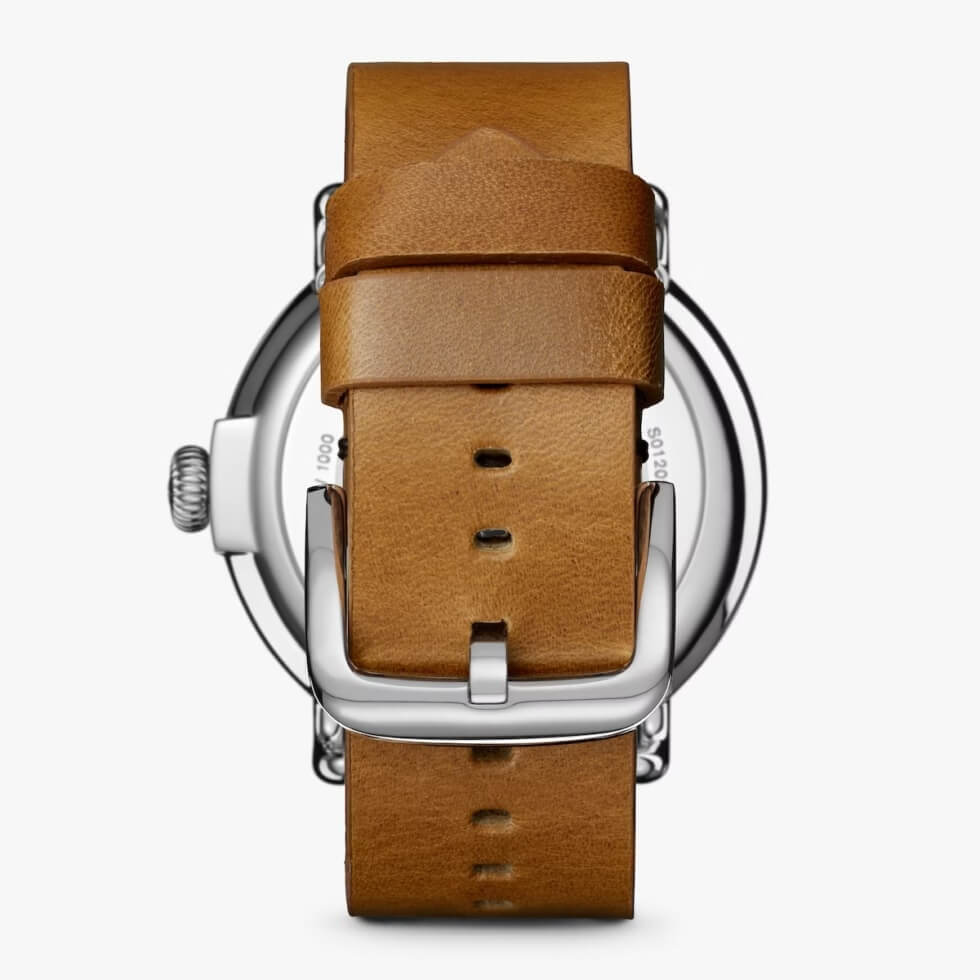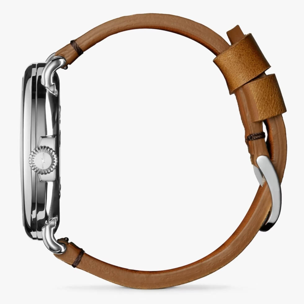 Surrounding the glass window are the serialization numbers to designate which unit your 10-Year Limited Edition Runwell is out of 1,000 examples. Furthermore, the “10 Year Edition” script is also deep-etched into the metal plate. Don’t let moisture get in the way of your dapper accessory as Shinola engineered it with a 5 ATM water resistance. Finally, it ships with a bourbon-colored leather strap and a classic pin-buckle closure.