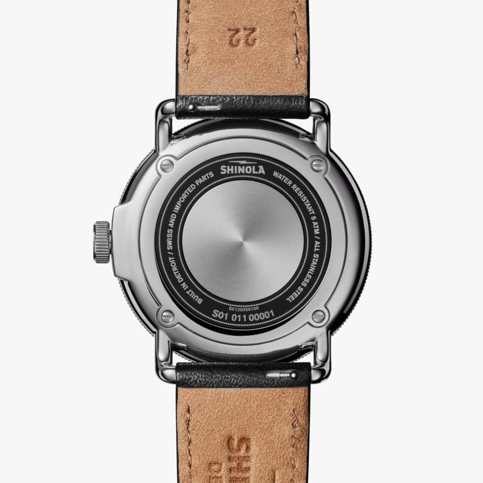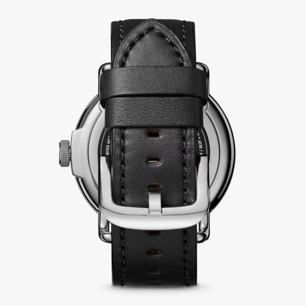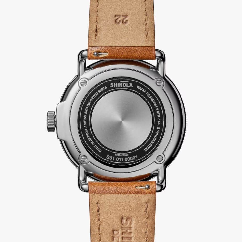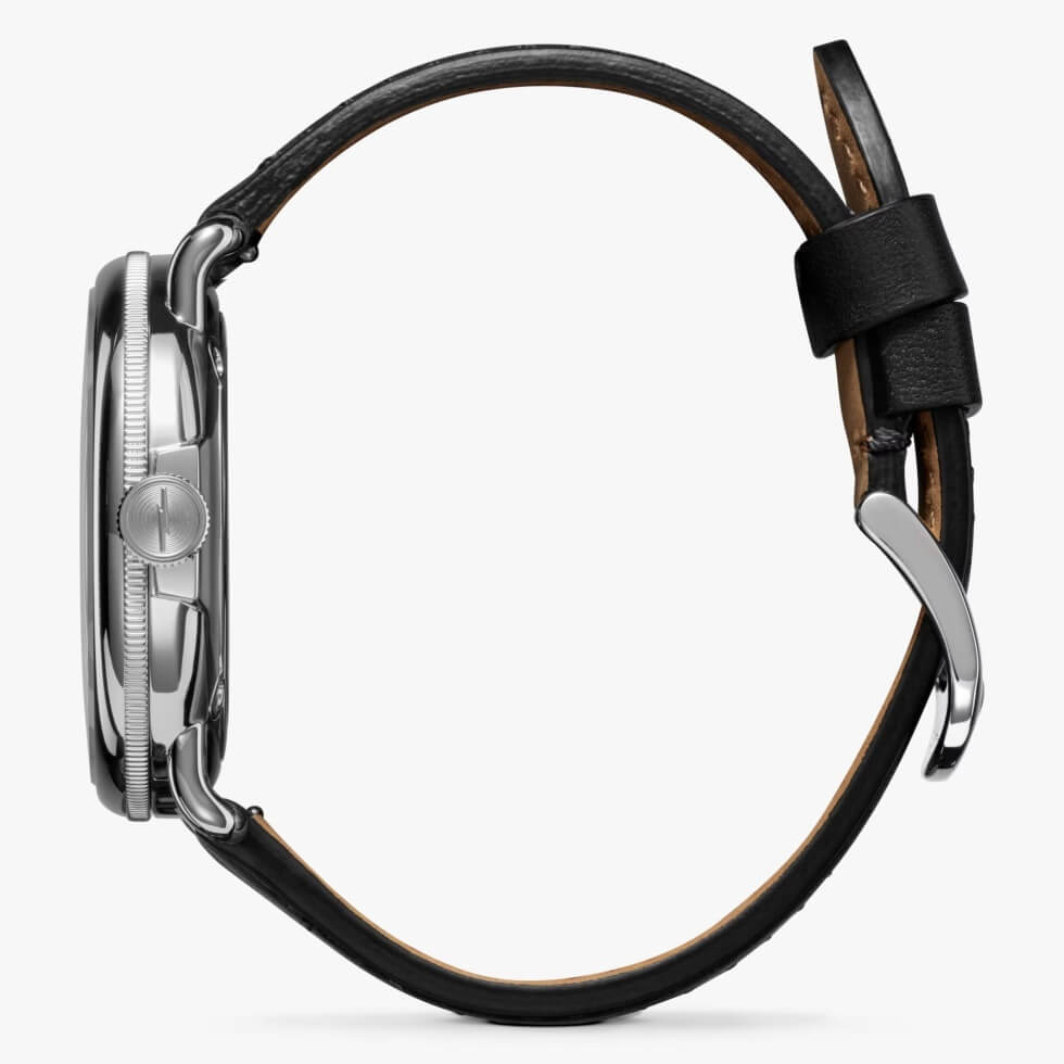 According to Shinola, “this timepiece represents the intersection of classic, streamlined style and the exploratory era of automotive craft.” It flaunts a 43 mm stainless steel case with a polished finish. The case band showcases a coin edge texture, while the top of its screw-down crown shows the lightning bolt emblem.