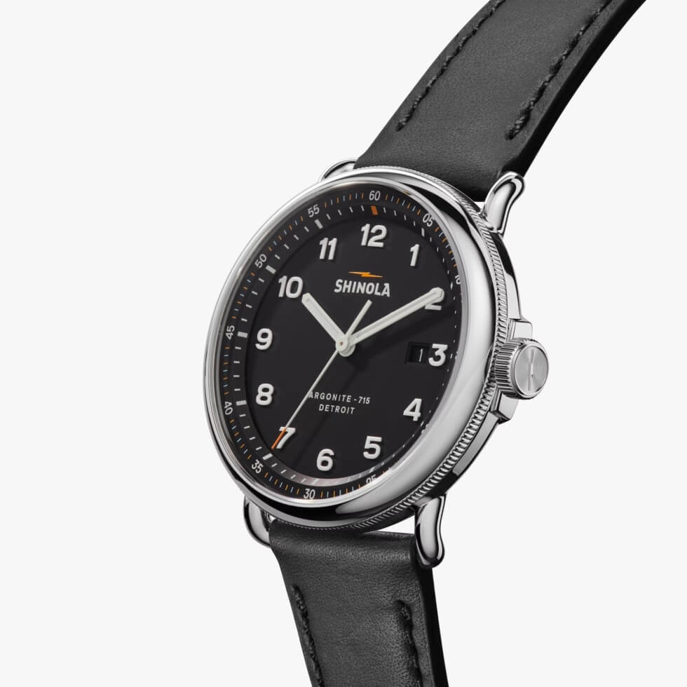 At 3 o’clock, we have a date aperture and the Shinola signature at 12 o’clock. Inside the sleek housing beats an Argonite 715 quartz movement for its timekeeping functions. The Canfield C56 comes with a leather strap with quick-release pins. The watch ships inside a classy wooden box.