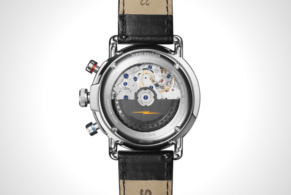 It features a 44-mm stainless-steel case with a striking coin edge on the upper half of the caseband. The exhibition caseback shows off the Swiss-made Sellita SW510 BH calibre and its rotor with Shinola’s horizontal lightning bolt emblem.