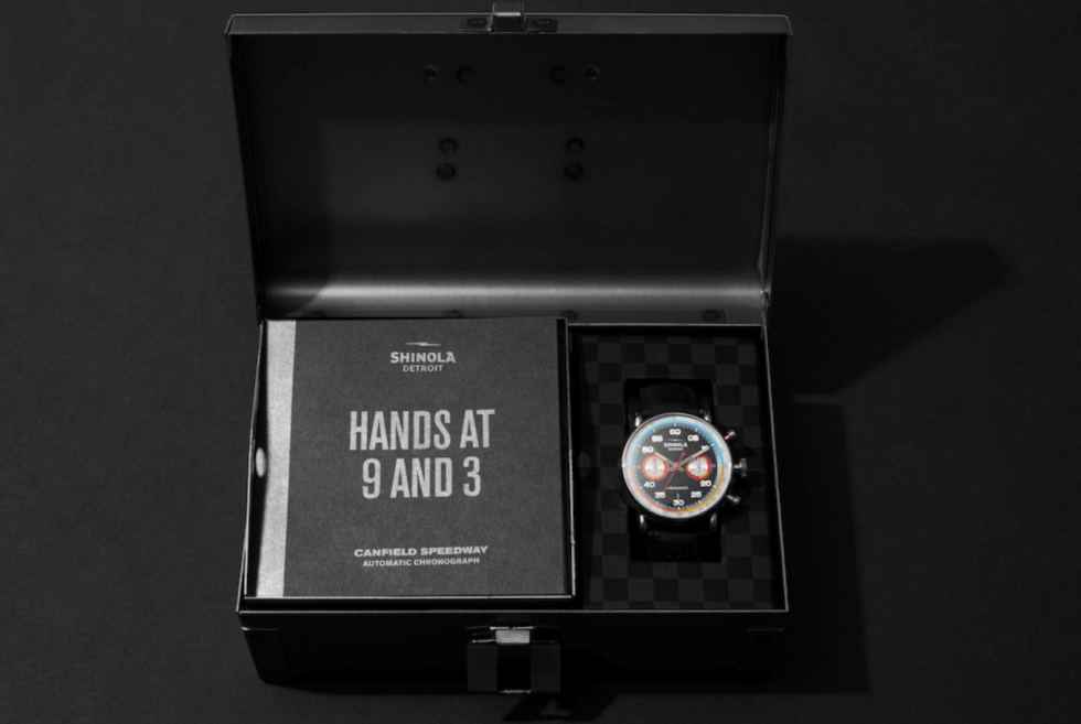 Detroit-based luxury brand Shinola is known for its premium catalog of products. These range from journals, apparel, office goods, audio, bicycles, clocks, jewelry, and watches. At first glance, the colorful presentation of the Canfield Speedway might be odd for some people.