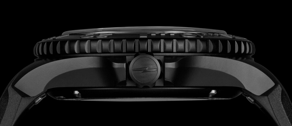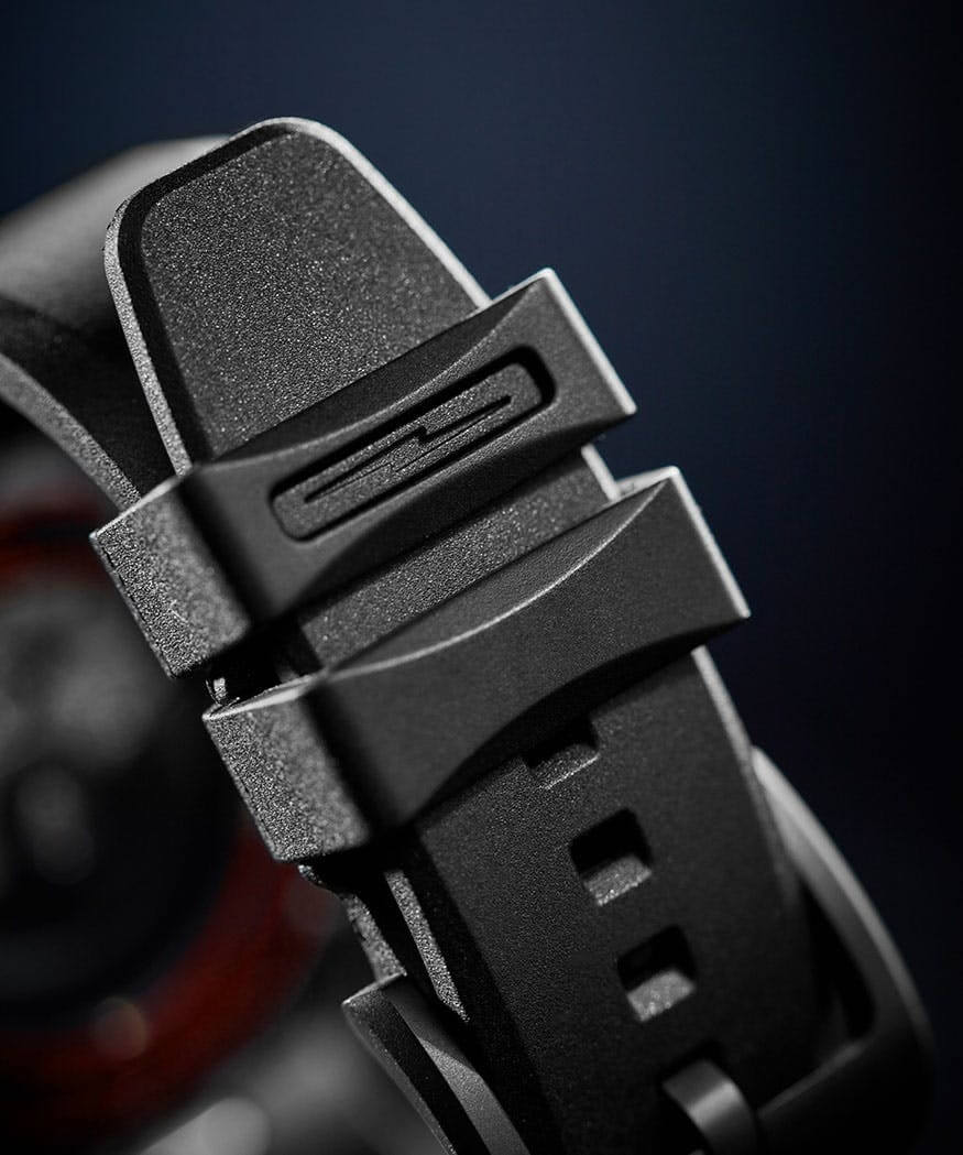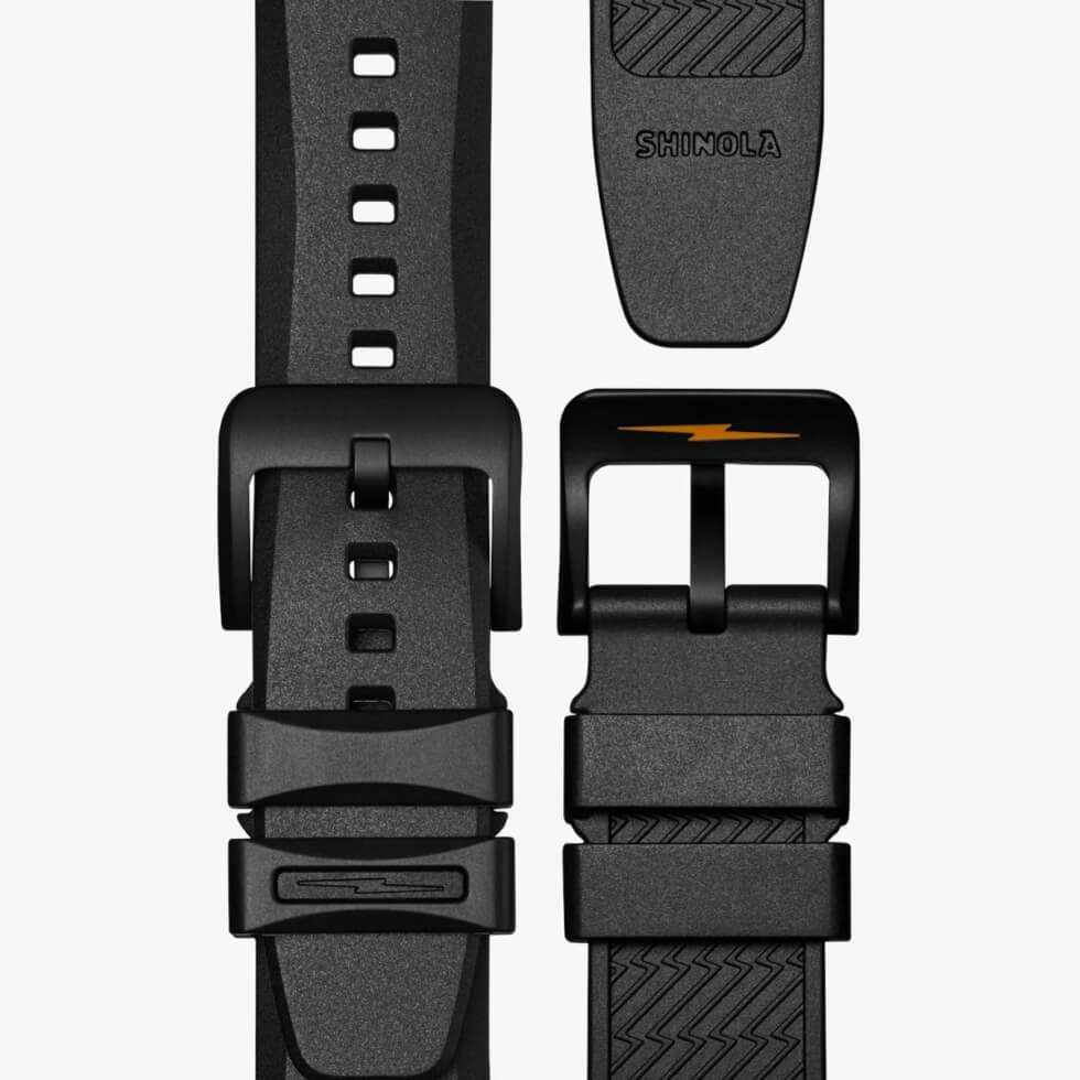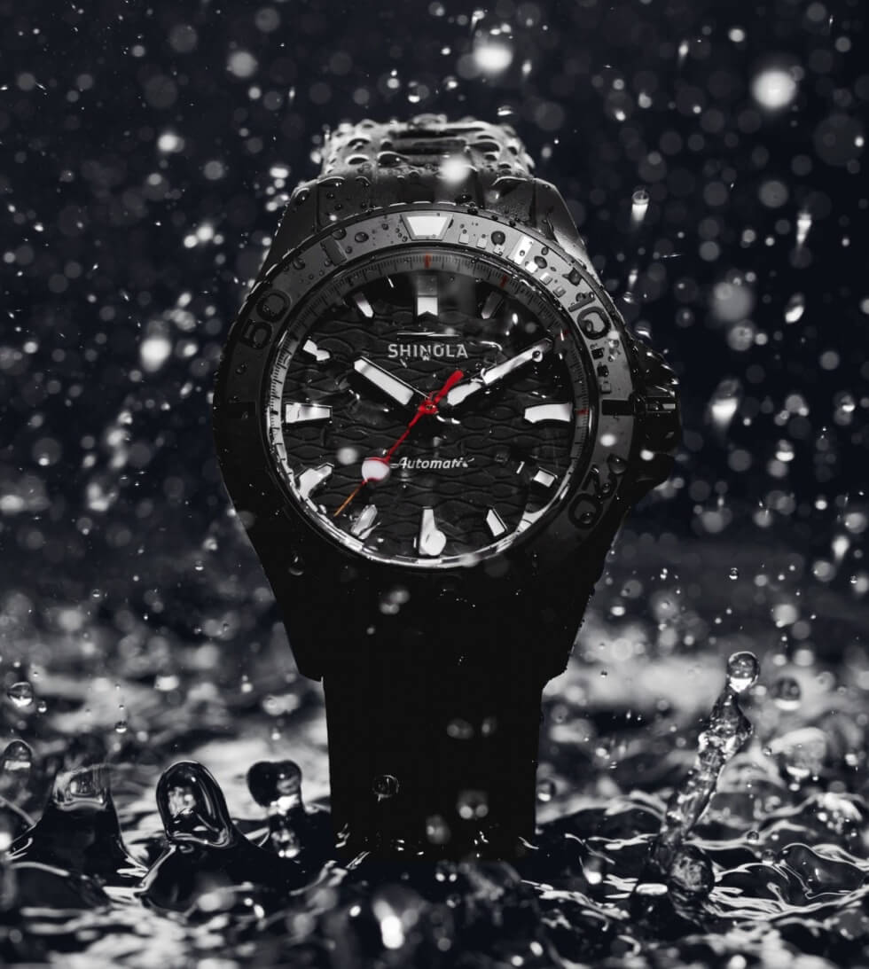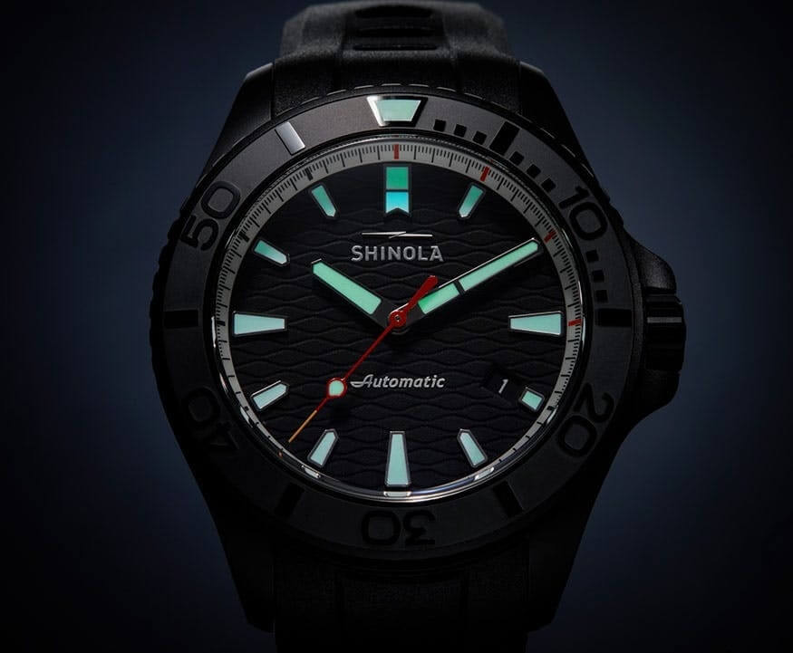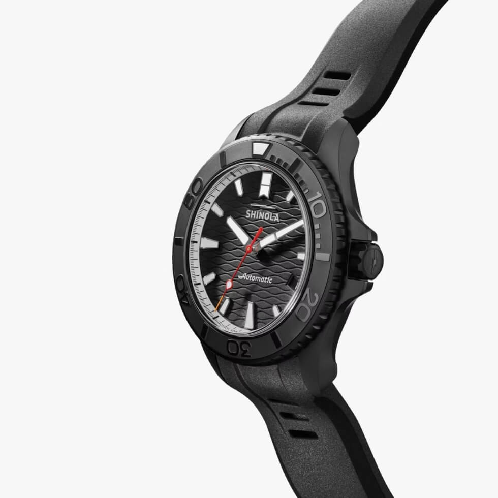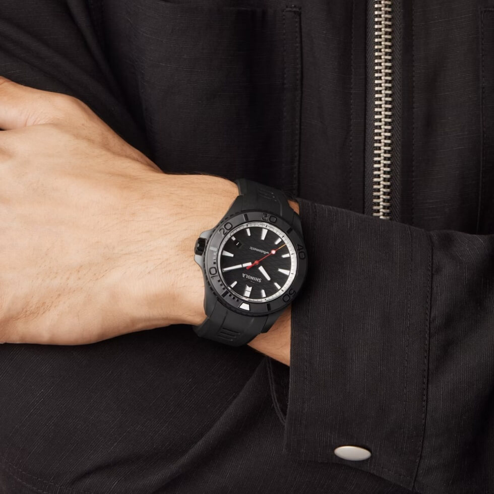 With the city’s automotive heritage, Shinola embodies a dashing sporty aesthetic. It’s crafting the 43 mm x 14.55 mm round case out of black PVD-coated 316L stainless steel. Moreover, it then receives a matte black ceramic plating for enhanced durability and corrosion resistance.