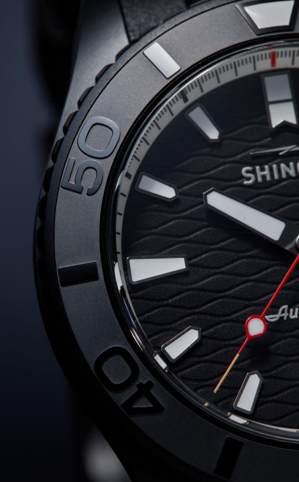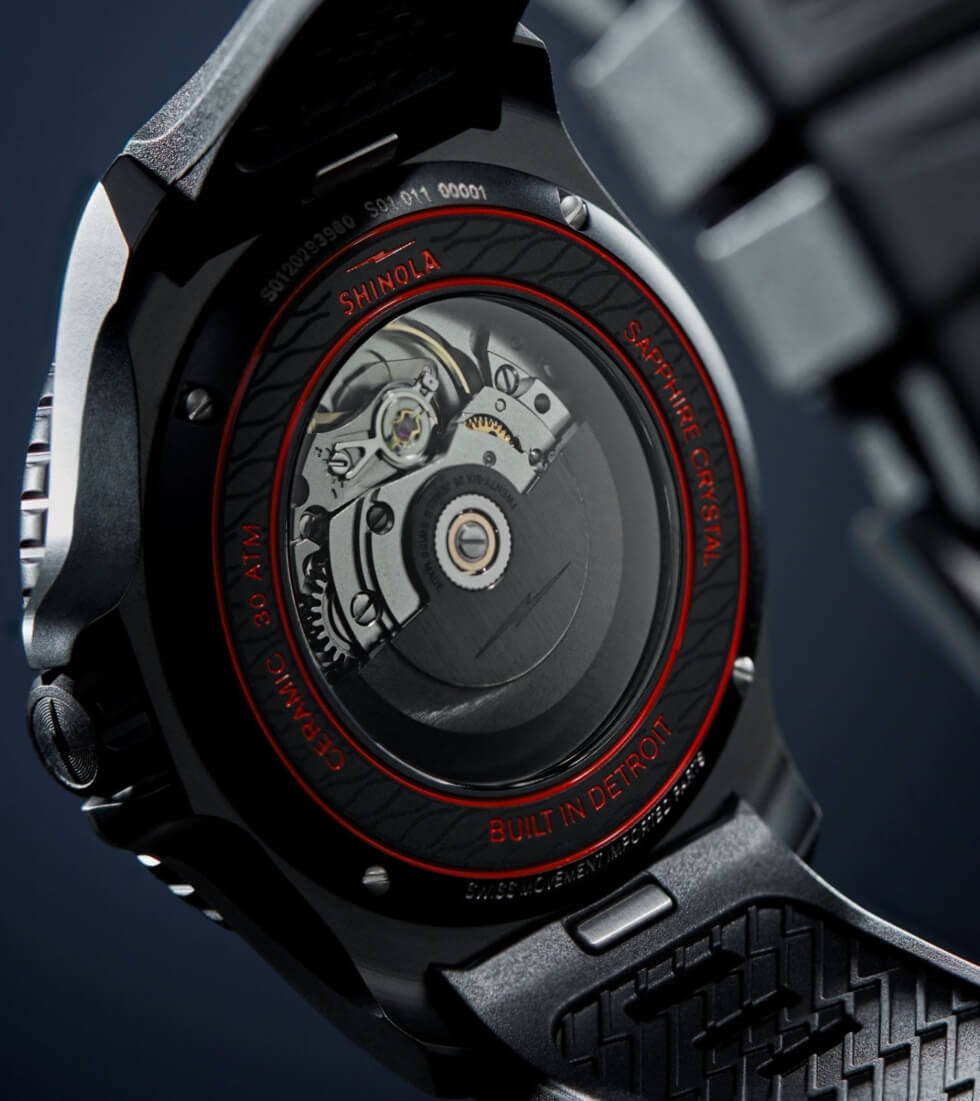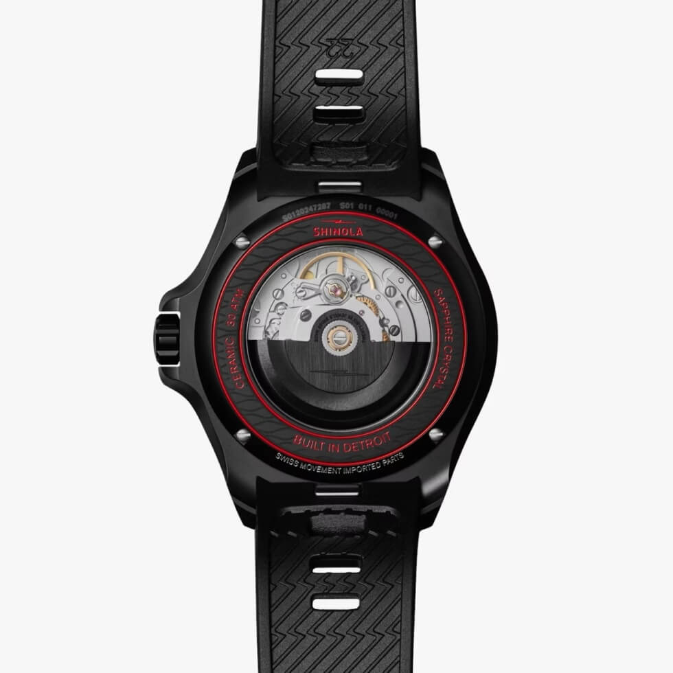 You view these via the exhibition case back’s sapphire window adorned with red accents, script, and signature. A sapphire crystal covers the matte black dial framed by a minute track on the flange. Additional contrast comes from the decorative wave patters, applied hour markers, hands, and Shinola branding.