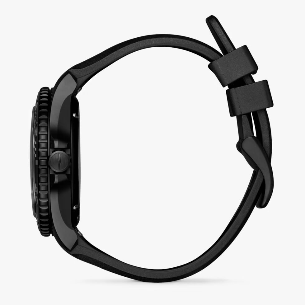 Likewise, a date aperture is located beside the 4 o’clock index. Low-light legibility is possible courtesy of the lume coating of all relevant components. Shinola completes the Ceramic Monster Automatic’s ensemble with a black rubber strap and pin buckle closure.