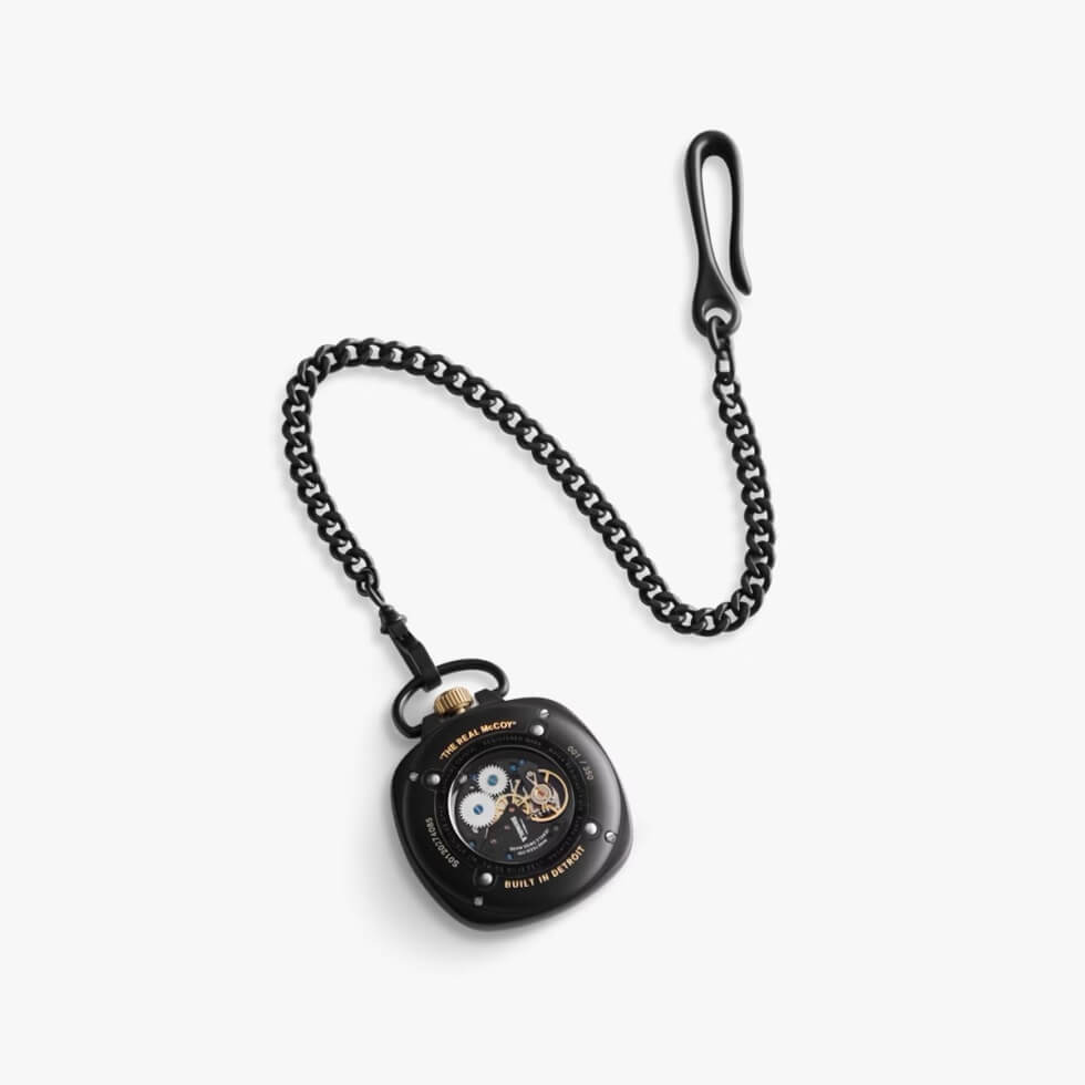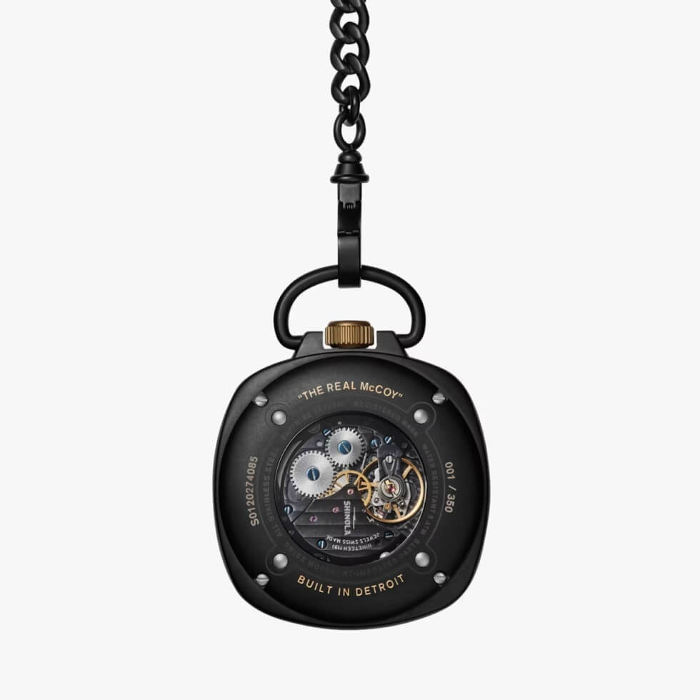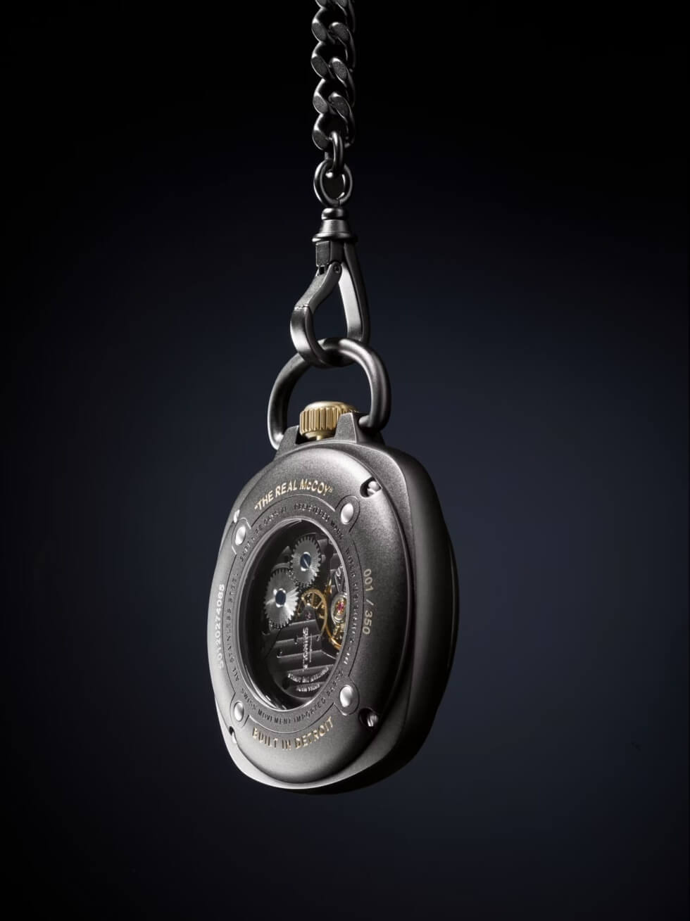The rear cover proudly shows off the laser-etched serial number, along with the words ‘”The Real McCoy,”‘ and “Built in Detroit.” A matte black dial graces the front with Arabic numeral hour markers, gold hours/minutes hands, and a red seconds hand. A golden crown adorns the top of the pocket watch. To further embody a classic vibe, its functions are powered by a manual movement.