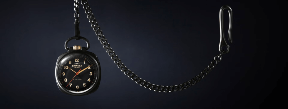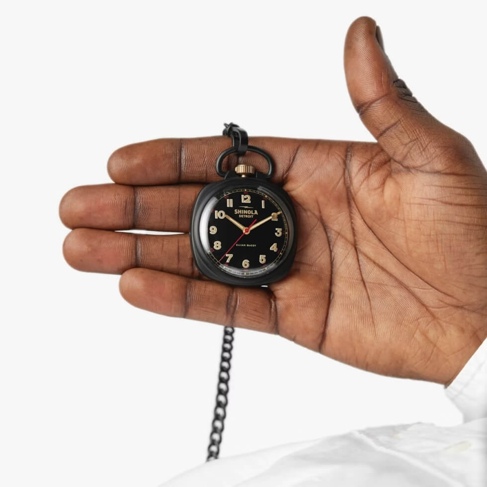 Shinola equips the Elijah McCoy with a hand-wound SW210-1 caliber, which owners can view through the open-worked case back. It promises a 42-hour power reserve, but try not to forget to prime it when needed. The pocket watch ships with a black stainless steel chain and a custom wooden display stand. Only 350 examples are available.