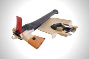 The Adventure Mate AM-V2 Multitool packs an axe, hammer, saw, shovel, and hook that locks in place in a carbon-fiber-reinforced nylon handle.