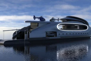 Lazzarini Design's signature avant-garde approach is on full display with the open-air structure of the 279-foot Icaria superyacht concept.