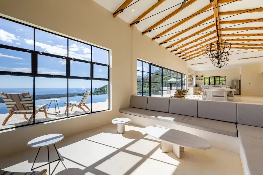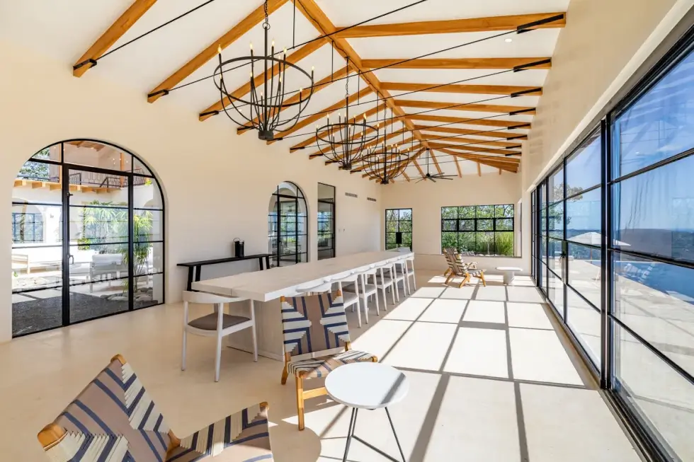In terms of interior and outdoor features, think tranquil courtyards with seating areas, high ceilings with wood beams, lots of glazing, and light stone and wood throughout. Its expansive great room boasts floor-to-ceiling and wall-to-wall views of the Pacific coast. Moreover, each spacious bedroom has an indoor-outdoor shower.