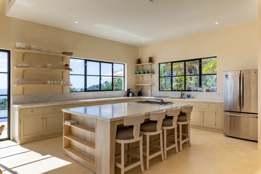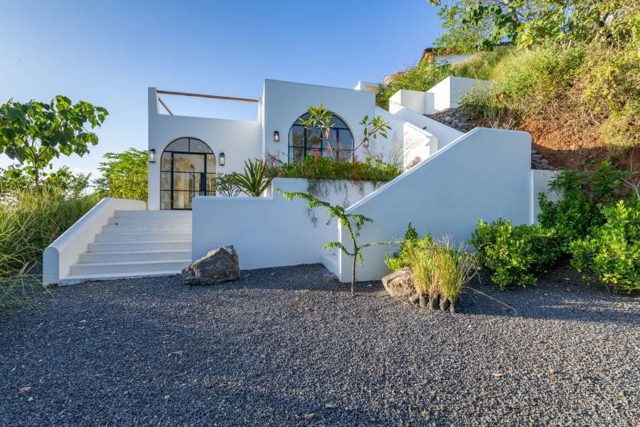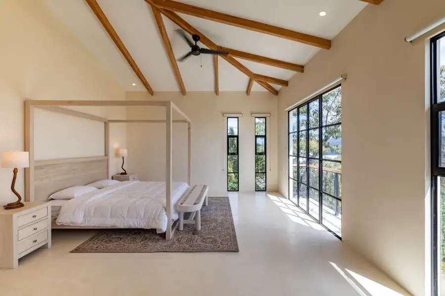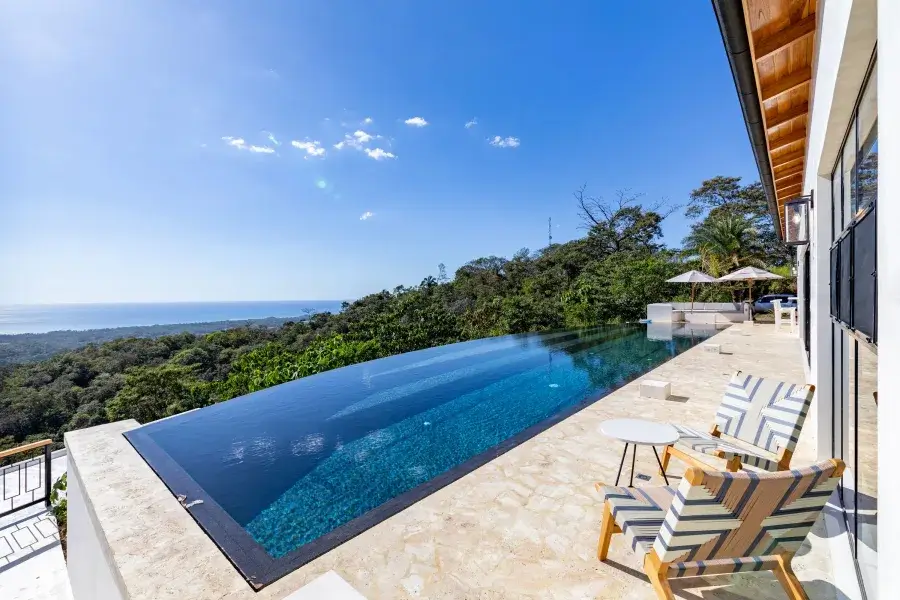 Shuniya also has a gourmet kitchen with a center island and a massive 14-person dining table that overlooks a spacious balcony that opens to an infinity edge pool offering stunning views to the south of Playa Guiones and the Costa Rican mountains. Guest accommodations are courtesy of the multi-level guesthouse that’s accessible from the main residence via a series of exterior stairways. The guest house has its own open kitchen and living area and an ensuite bedroom, an office, plus a bunk room.