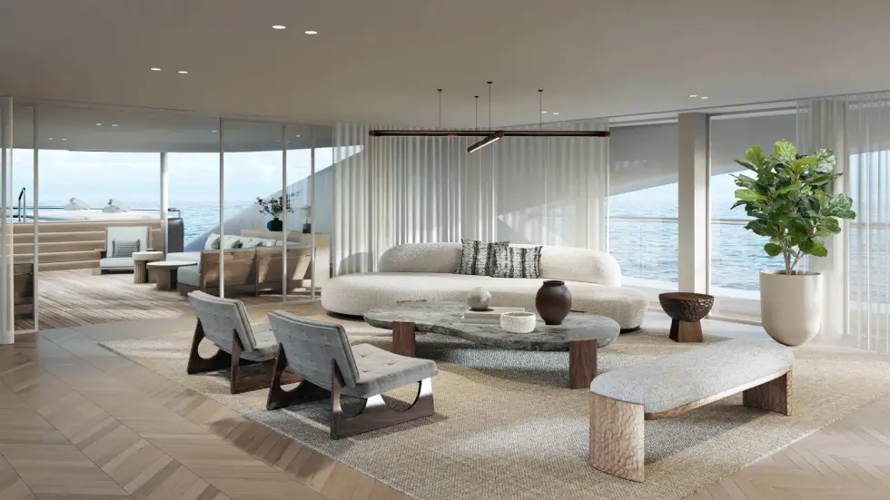 Although it was not specified, it’s likely the superyacht can also run its hotel load on battery power only. Furnishing the interiors and other spaces is Acoya Design House as it imbues a modern minimalist motif with natural tones and materials. The owner’s suite occupies the upper deck and features a terrace with lounge seats and a Jacuzzi.