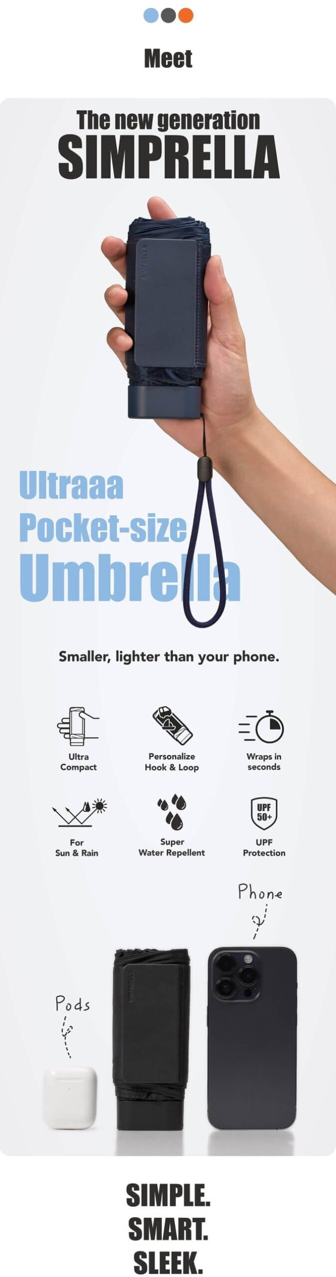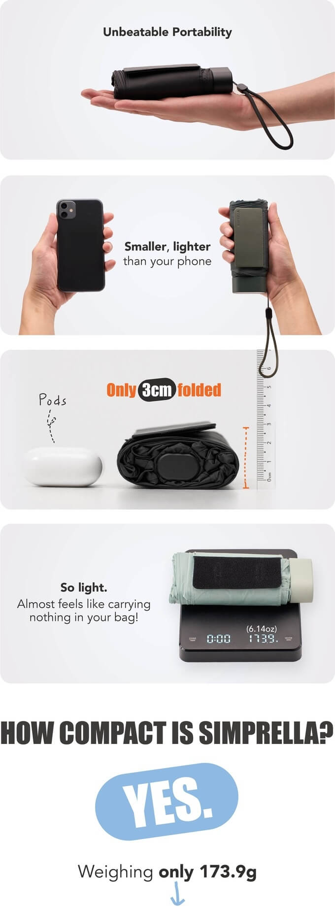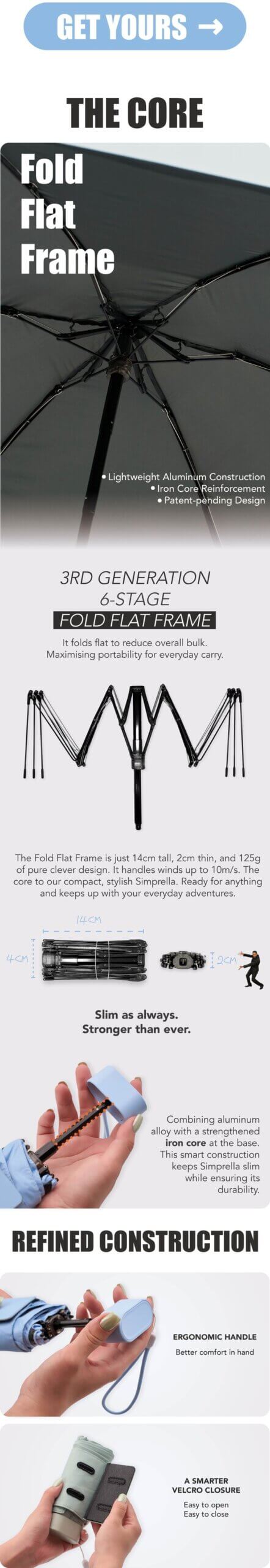 Despite its uber-compact size, Simprella means business when it comes to keeping you dry and protected from the sun, rain, and wind. It offers wide coverage and boasts a sturdy yet lightweight aluminum frame reinforced with an iron core at the base. It can handle winds up to 10m/s and stays strong against the onslaught of wind+rain.