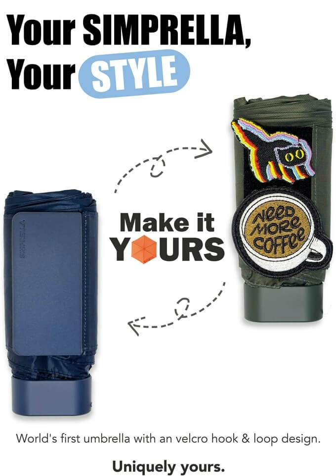 Forget fumbling or wrestling with the umbrella in the rain. Unlike the common flimsy and thin snap-on clasps, Simprella has an extra wide Velcro closure. Also when folding, a simple shake is all it takes and you can wrap it away for storage. You can even customize the umbrella with a Velcro snap-on design to make it uniquely yours.