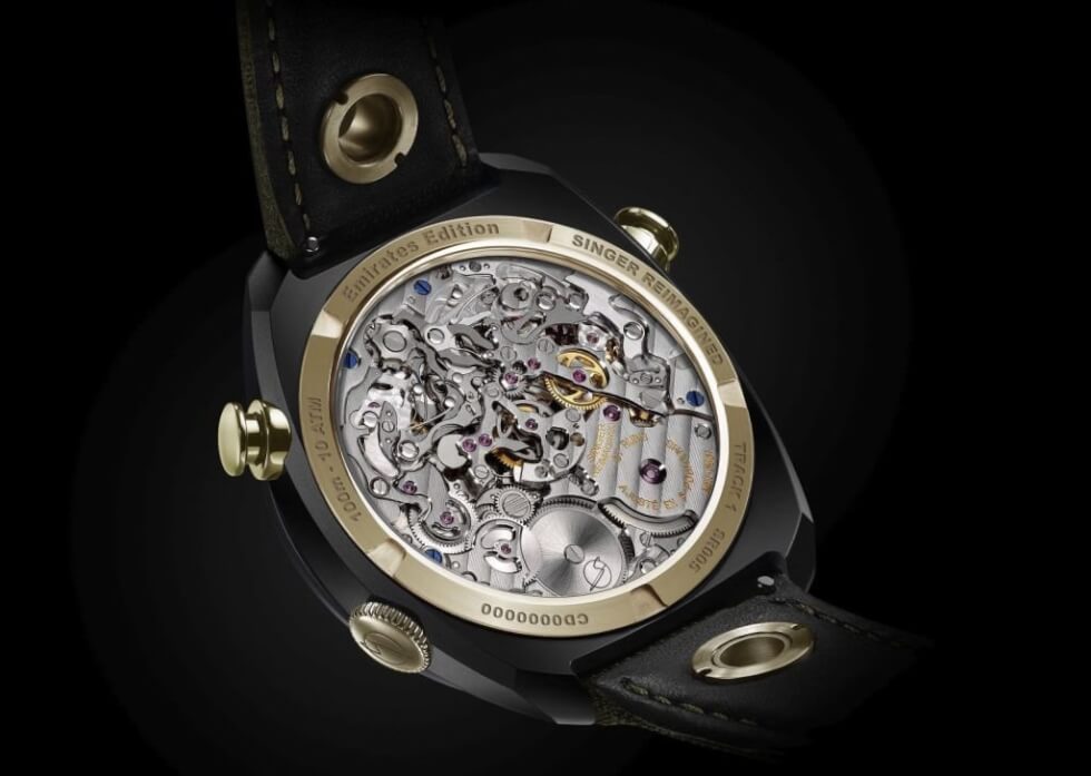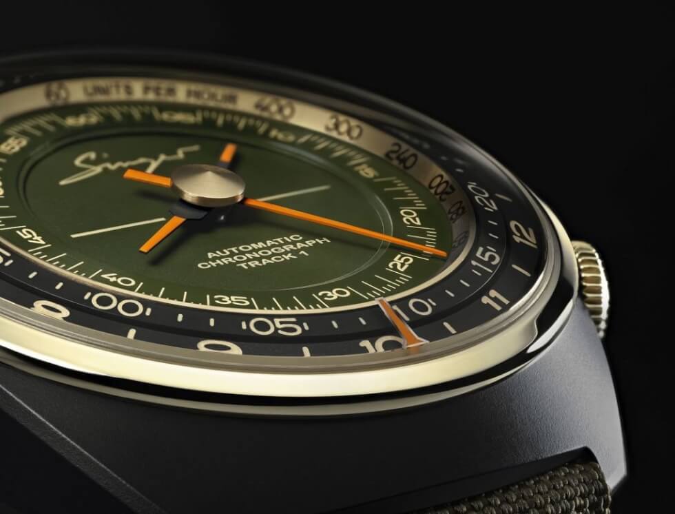 Nevertheless, let’s check out what makes this sophisticated timekeeper so special shall we? The 43 mm case is ceramic-aluminium and gives it a matte finish. It serves as a striking backdrop to the grade 5 titanium sporting a golden hue from the zirconium treatment. The khaki green dial of the Singer Reimagined Track1 Emirates Edition blends perfectly with the black outer rings. Don’t let the appearance fool you because what you think is the main complication in the middle is actually something else.