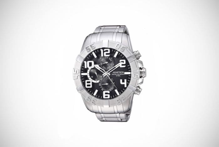 The case diameter on this beauty is bigger than most, giving you more room to consult the time or check other details such as the date in the adequate calendar window. The watch is primarily made with strong stainless steel, which also makes it highly water-resistant and won’t falter in the shower or at the beach.
