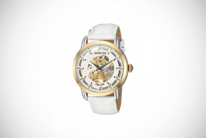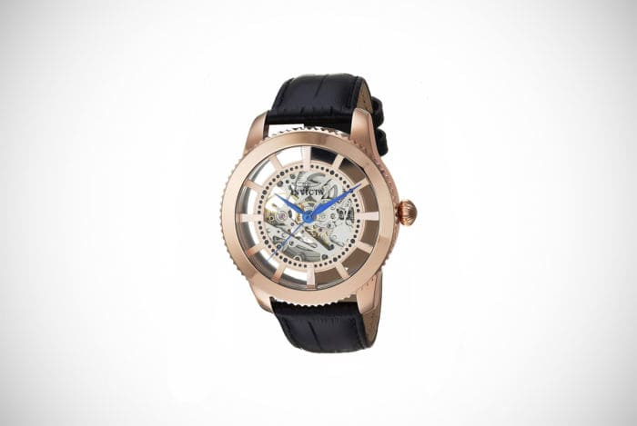 The calfskin leather strap meets a rose-gold case housing other rose-gold trimmings and uncovered mechanics. The intricate engineering and craft of making the Invicta watch is only partially hidden by the rotating and striking blue hands. All of these nice touches are kept immensely protected with a lame fusion crystal glass.