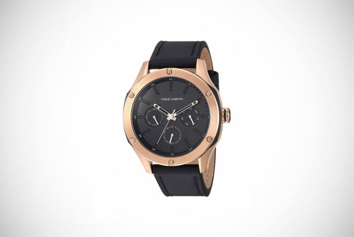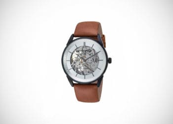 If minimalism is what you want from a skeleton watch, then you want the Vince Camuto watch here. Although its skeleton aspects are limited to its bare-bones hands, the watch does look awesome. The matte black leather strap matches the face of the watch with both areas being divided by a popping gold case trimming.