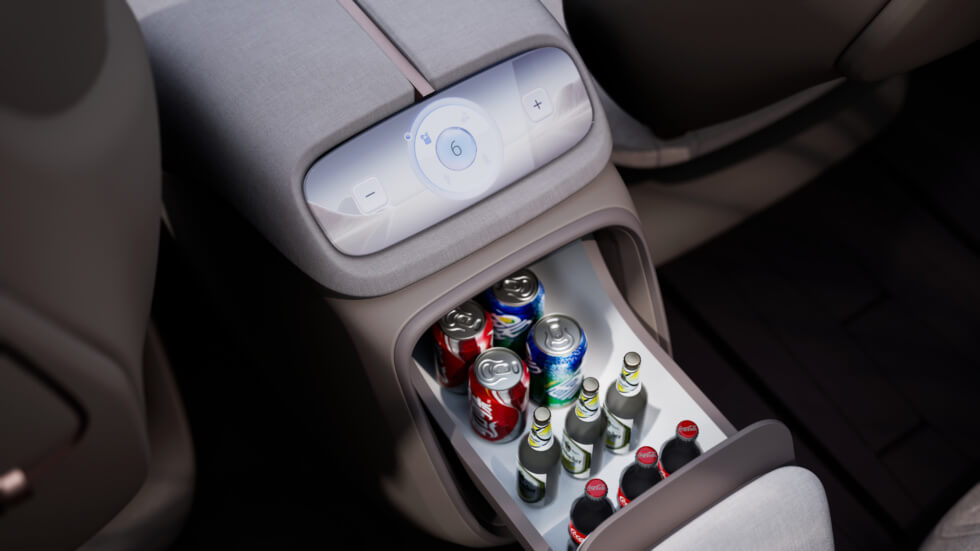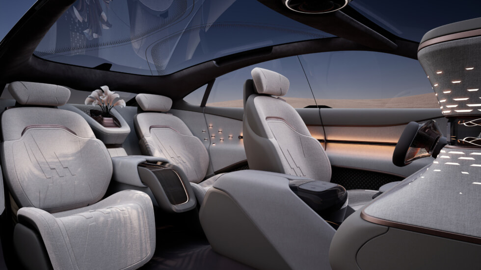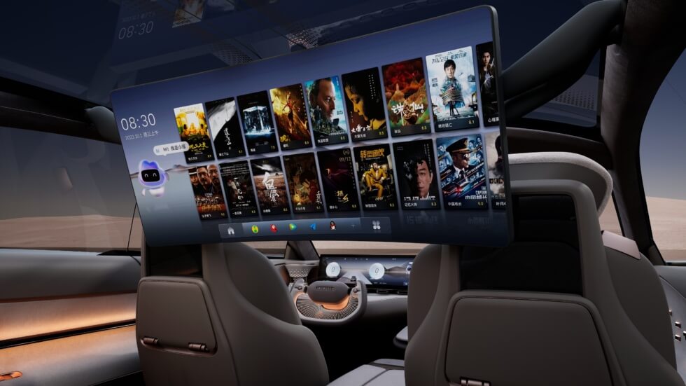 A massive headliner-mounted display can be deployed for second-row passengers. With mobile connectivity, it can be used for productivity or entertainment. Carefully arranged LEDs softly illuminate the cabin and double as mood lighting. The SKYHOME also leverages artificial intelligence dubbed “Xiaowei” for a variety of convenient functions.