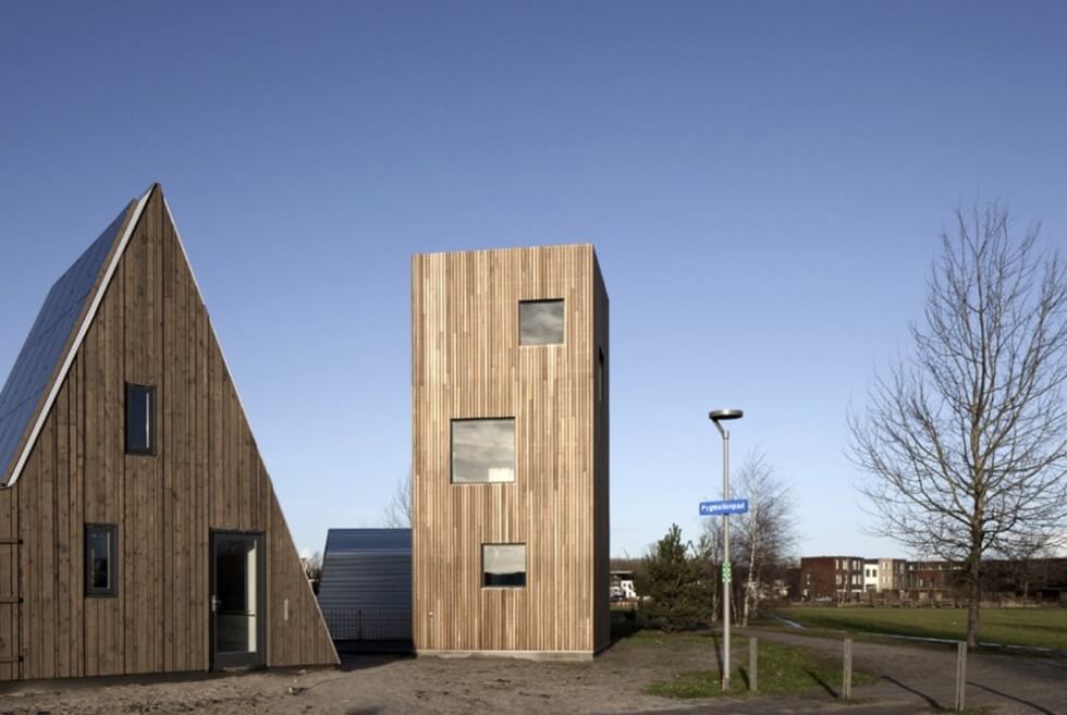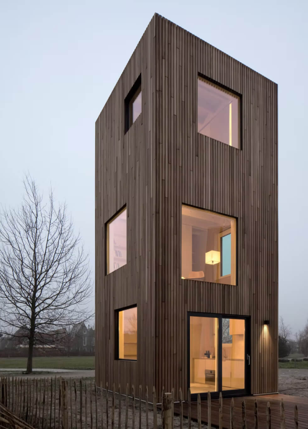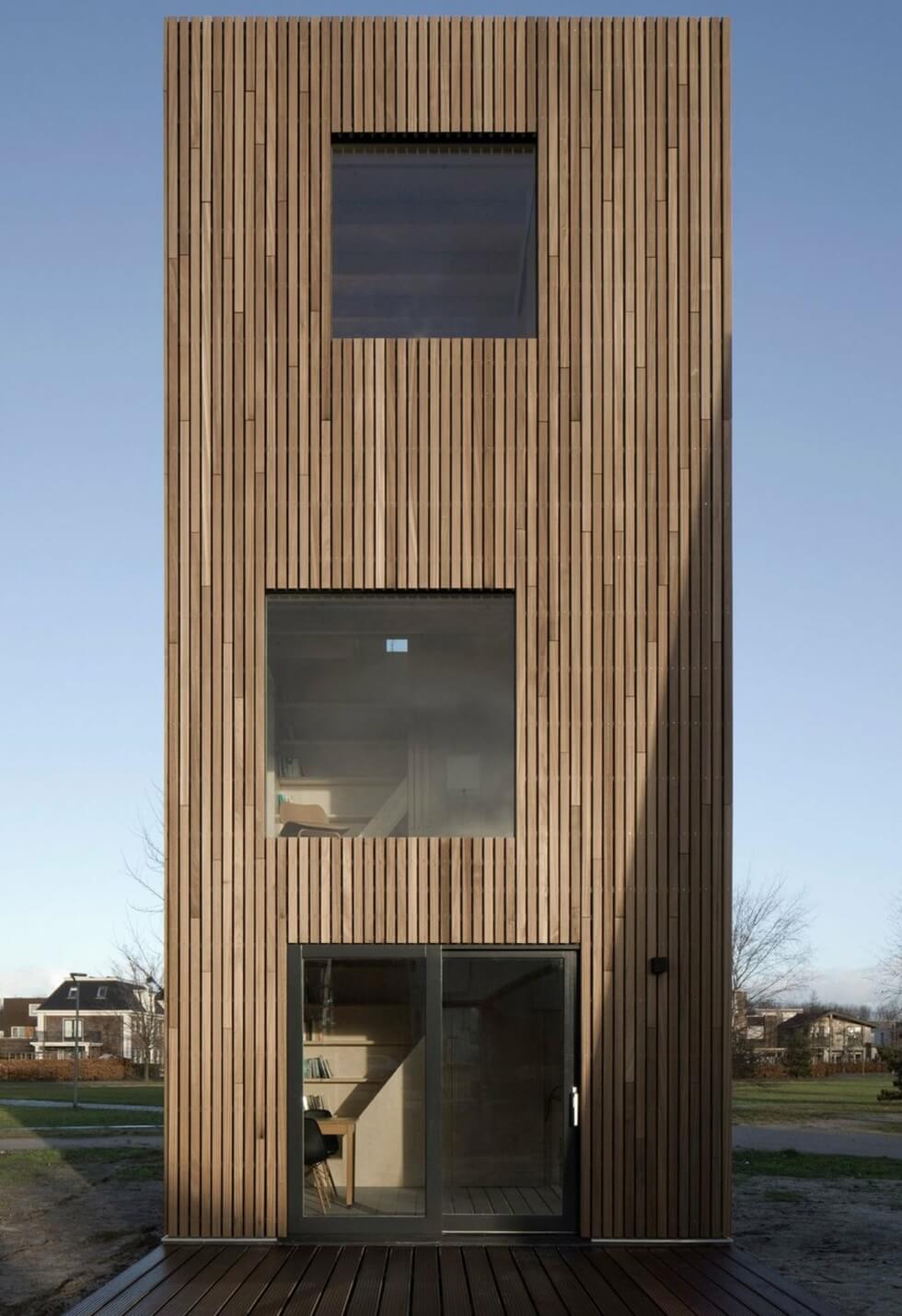 It may look like just a vertical structure clad in wood and glazing when viewed from afar. But a closer inspection reveals it as a residential building that sits on a sliver of urban space beside another uniquely- structured gabled house.