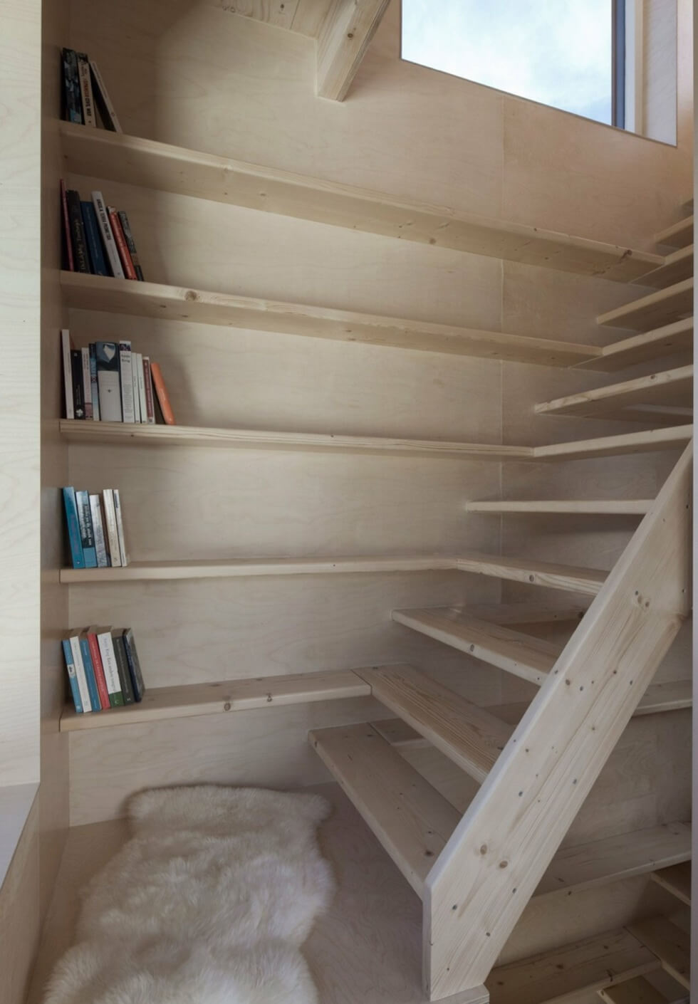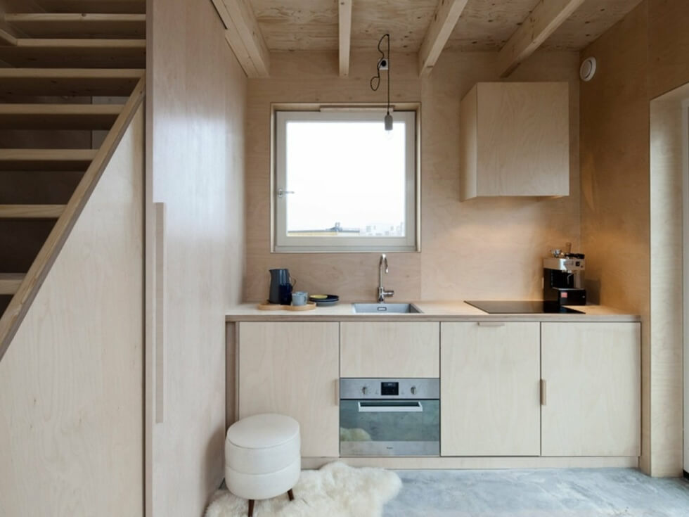 Large windows face toward the direction of the most sunlight for natural light and ventilation. There are also windows on both sides for efficient cross ventilation. Moreover, the Slim Fit house utilized walls as storage spaces using built-in shelving and made space-saving furniture made from birch plywood. Meanwhile, sliding plywood panels serve as movable doors that provide flexible space and privacy solutions between floors.