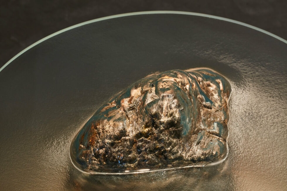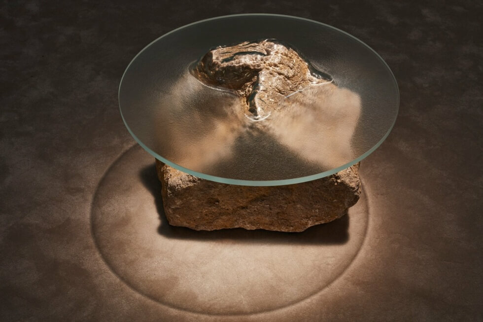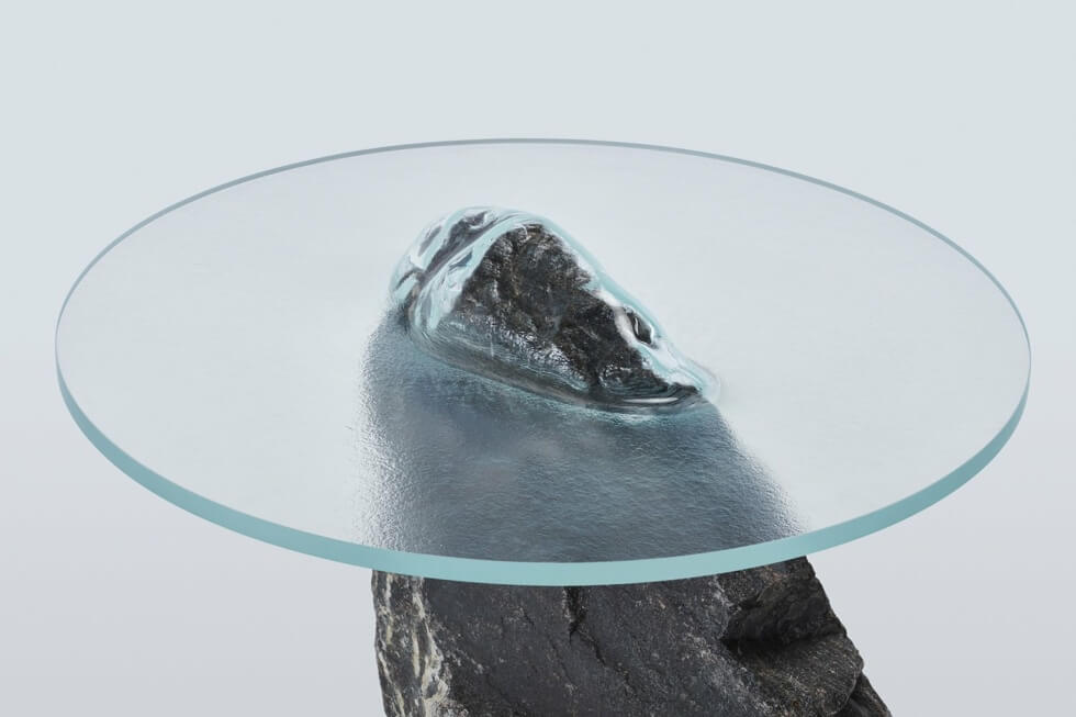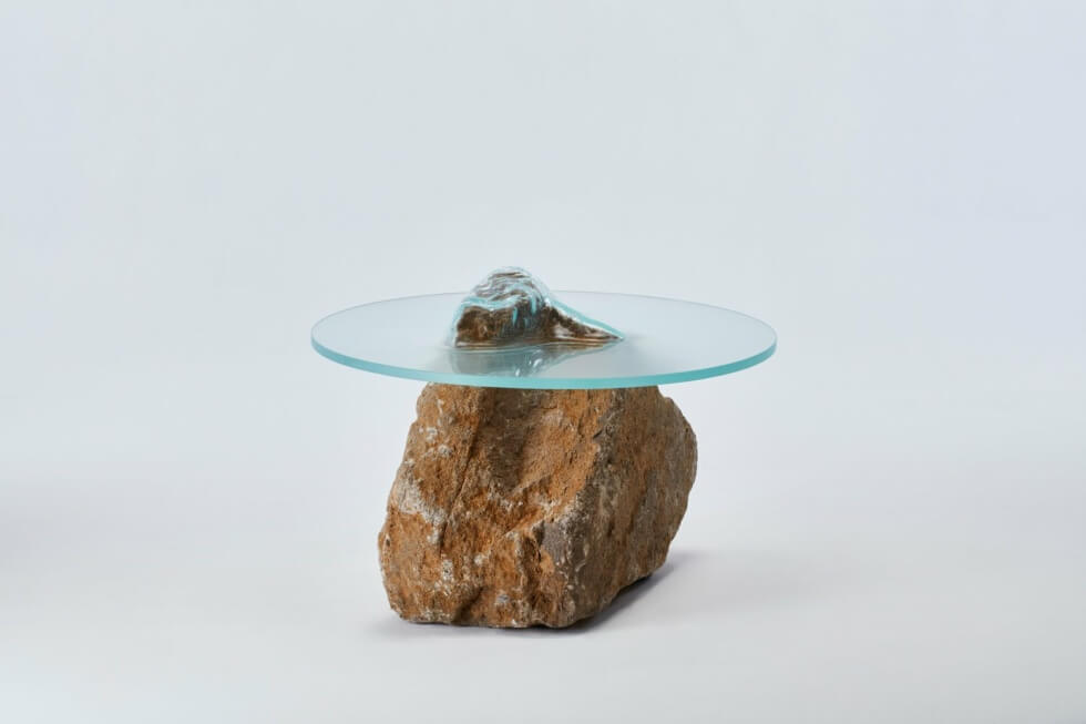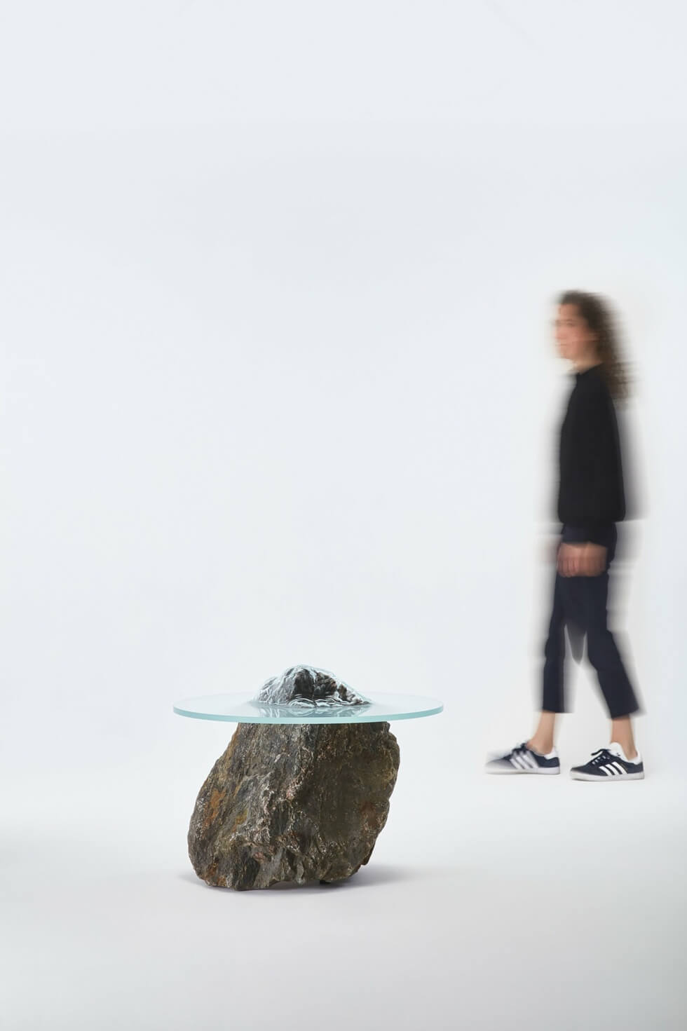 The process gives a rippling effect, reminiscent of the appearance of water when it touches and then flows down from an elevated rocky structure. The design does away with placing a piece of flat glass on top of the rock, as is contemporary with coffee table designs. Instead, the Slump Rock gives the impression of a soft and “relaxed” glass.