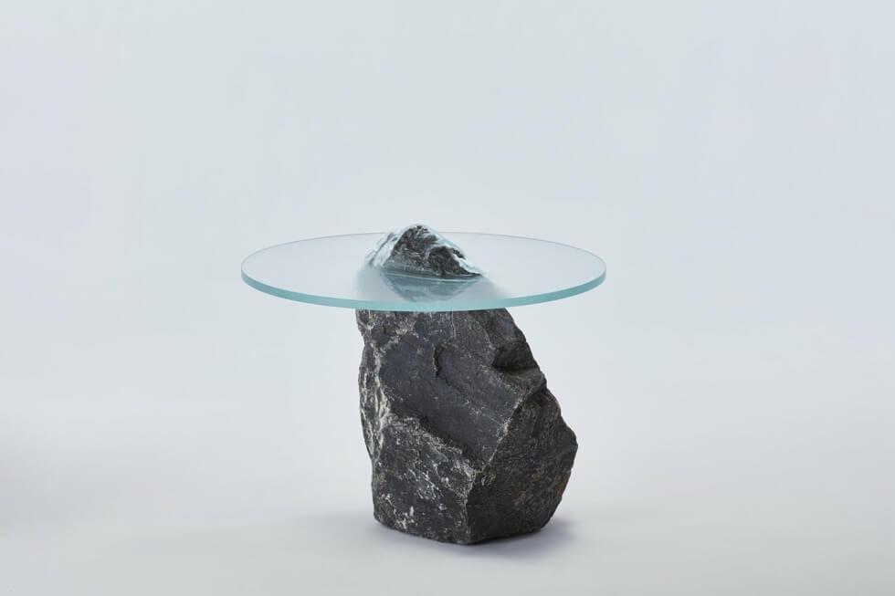Designer Paul Cocksedge described “Slump” as derived from a casual visual gesture. It’s an industrial masterpiece with a rock base and frosted glass table. Its unique form captivates the eye especially when viewed from the top. The glass appears like it melted in the middle. Then solidified to drape just above the rock.