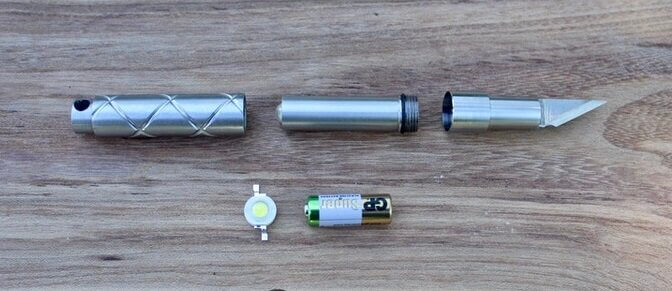 Sharpened by hand grinding, the blade can cut small ropes, hard plastic, open sealed boxes or cut and peel fruits and vegetables. The blade when deployed stays in place via a magnetic system. Meanwhile, the flashlight emits 100 lumens from its SMD power LED bulb with a lifespan of 30,000 to 50,000 hours. It uses a single alkaline battery 29A or a set of LR 626 button cells. The battery has a life span of 60 hours with constant use and an integrated resistor prevents overheating.