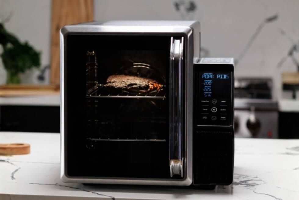 But what really sets the SmoqeX apart from other multi-functional smart ovens is its smoker feature. Smoking meat normally happens outdoors and is a lengthy process. But this machine simplifies the process indoors with a few manual controls. It has a dedicated compartment for real wood pellets.