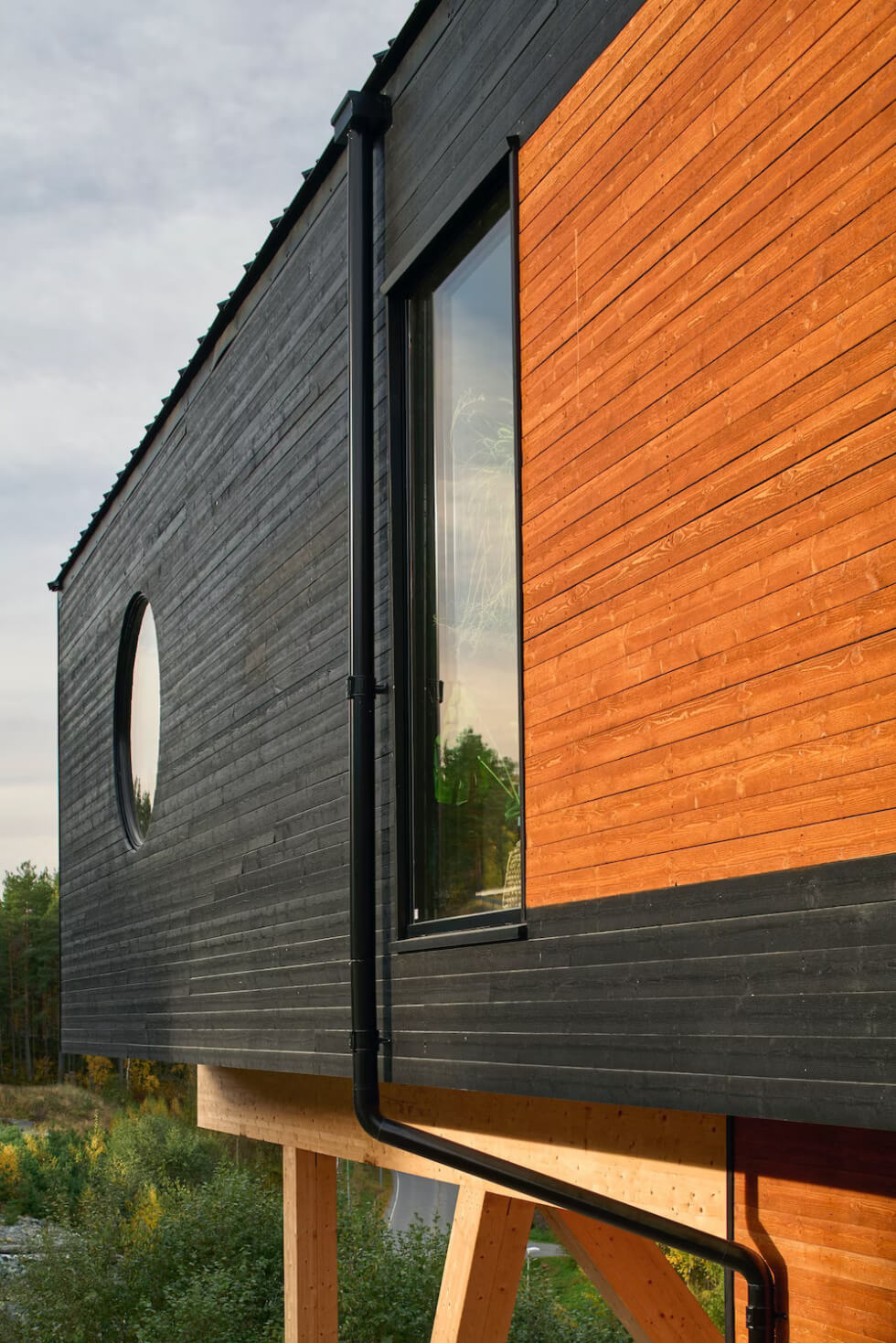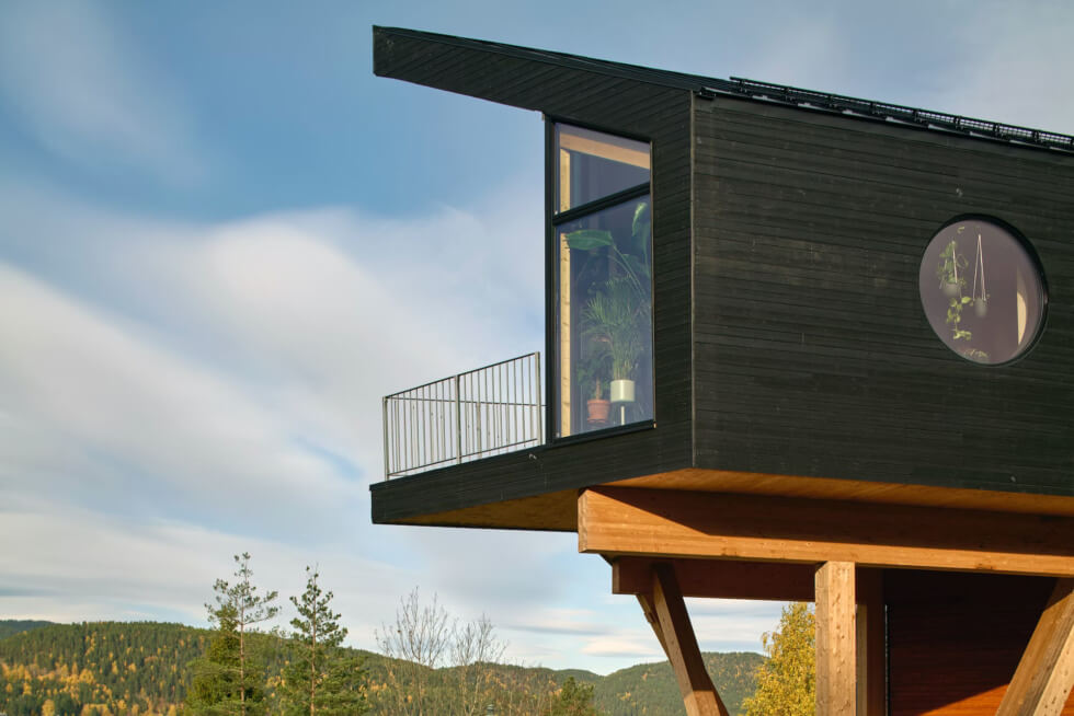 House Dokka consists of two floors placed on top of each other and slightly overlapping. The upper floor features a traditional shape with a pitched roof that crowns out over the steep plot and has a large glass surface at the end wall. Meanwhile, the lower level sits on a natural surface in the terrain with its roof forming the terrace of the main floor.