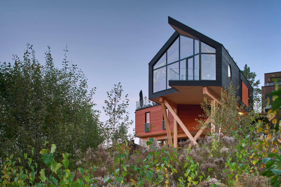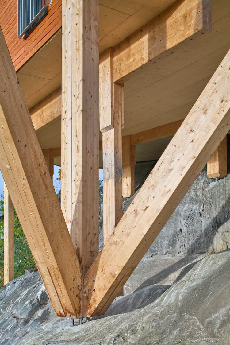 It appears like a floating treehouse held together by massive wooden columns on pillars drilled into the rock so it has minimal affect on the landscape. The design and orientation of the volume of the house and “the principles applied for construction and energy, facilitate a building that produces more energy than it consumes in less than 10 years. The house also provides 75 percent of the energy consumption for charging the family’s electric car in addition to the house consumption.”