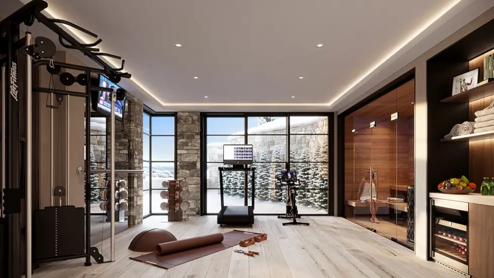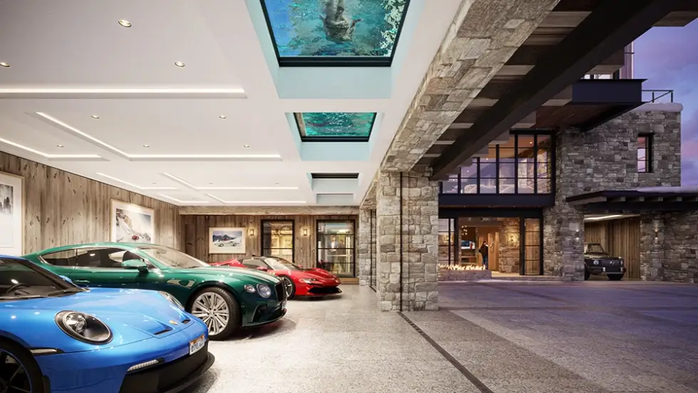 Of course, the Snowfall mansion will have an entertainment room for screening James Bond flicks. Meanwhile, other highlights include an office with its own bathroom, a fitness center, a sauna, a steam room, and a massage room. Outside is a 44-foot heated pool, a rooftop deck, multiple garages, a motor court, and separate lockups for ATVs and snowmobiles.