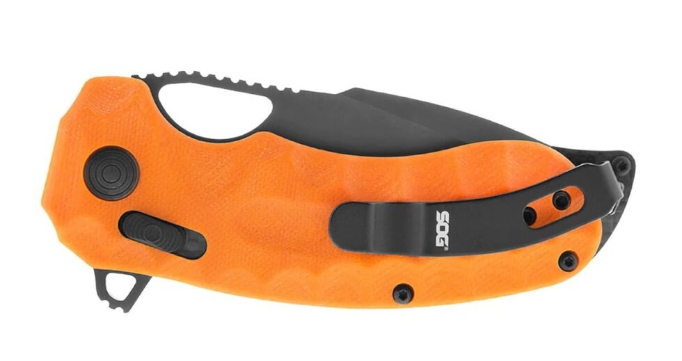 SOG’s KIKU XR LTE Knife is compact and portable at an overall length of 7.34 inches when opened and at 4.29 inches when closed. It also comes with a reversible low-carry pocket clip. It comes in an attractive blaze orange color or black and both compliment the blade’s dark appeal.