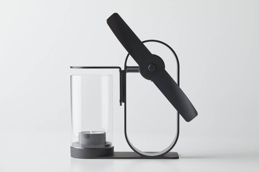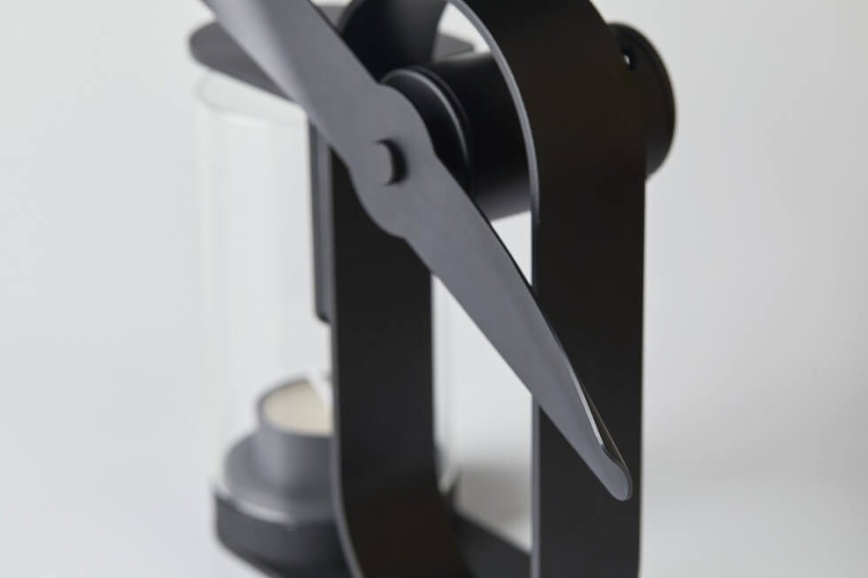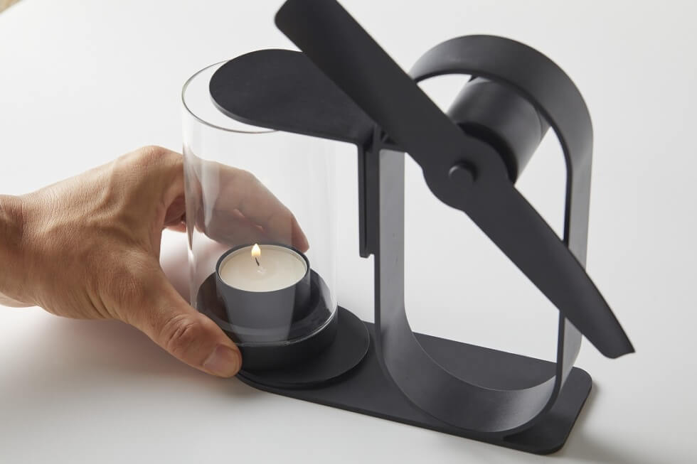 This device comes in three parts: a glass-encased candle holder, a fan, and a tray for the scented oil located at the back of the fan. It relies on thermoelectric energy that comes from heat generated by the candle carefully shielded by a cylindrical glass dome. The glass efficiently raises the heat of the flame and this heat ultimately powers a small, single-blade fan.