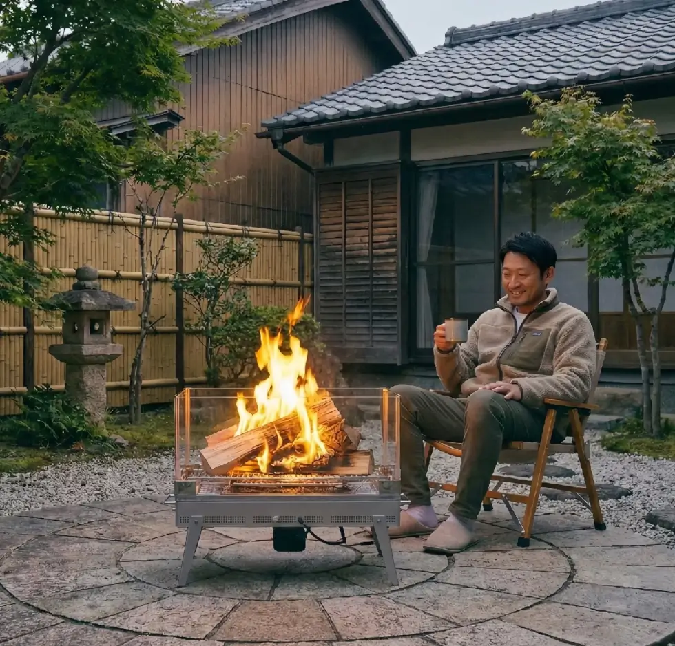 Meanwhile, the other fan serves as the secondary combustion that dissipates the smoke through 276 precision vents at the top, resulting in a mesmerizing smokeless flame. The flames stay safely encased inside heat-resistant glass high-purity quartz glass panels. that offer panoramic 360-degree views. They also serve as elevated frames for a grill set up.