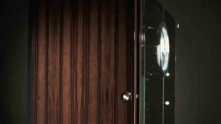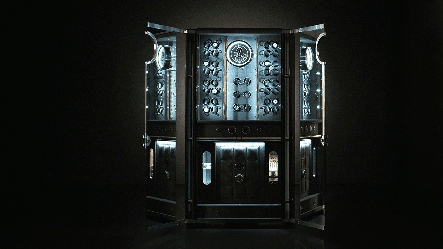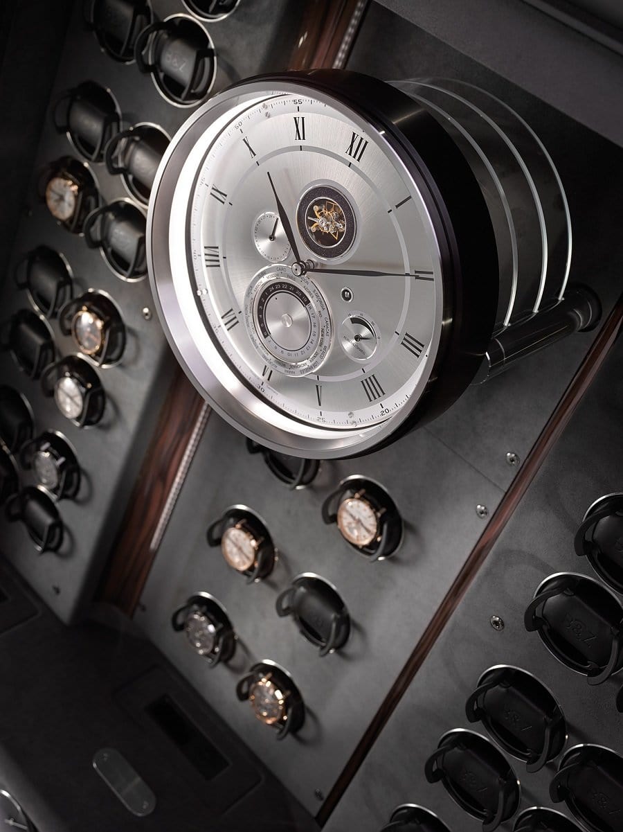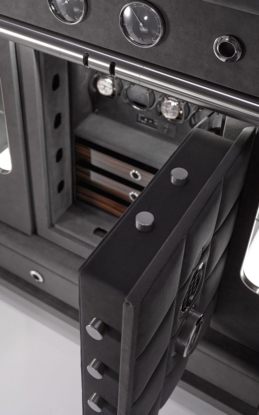 All of the contents strategically sit behind two bullet-proof spy glass panels. It only reveals what’s inside when the LED lighting system is on. Meanwhile, a sophisticated clock with a flying tourbillon sits inside a stainless steel enclosure. Moreover, it stylishly stays exposed even with the doors closed. Owners can activate the watch-winding system to keep the power reserves of their automatic beauties ready to go at a moment’s notice.