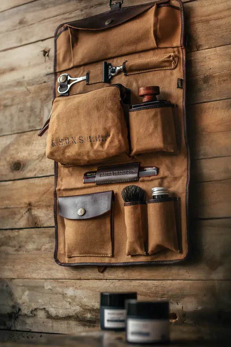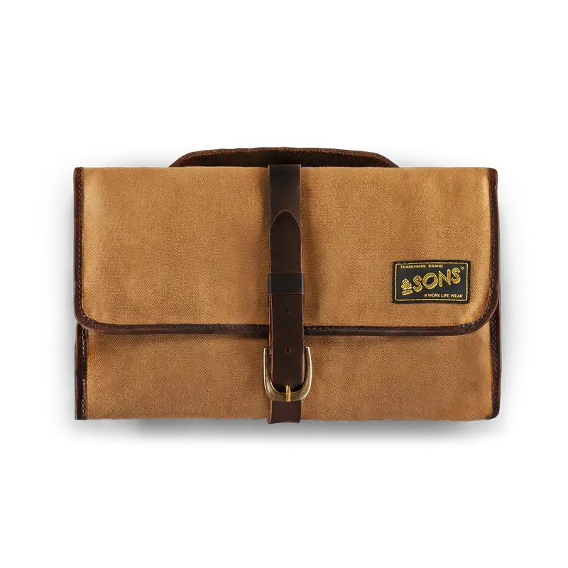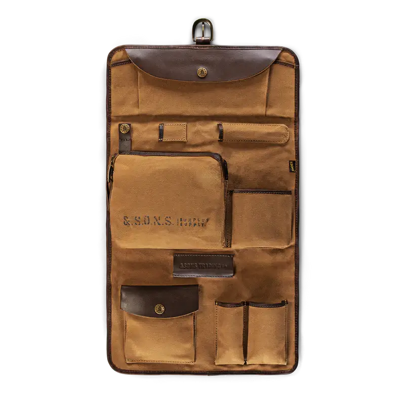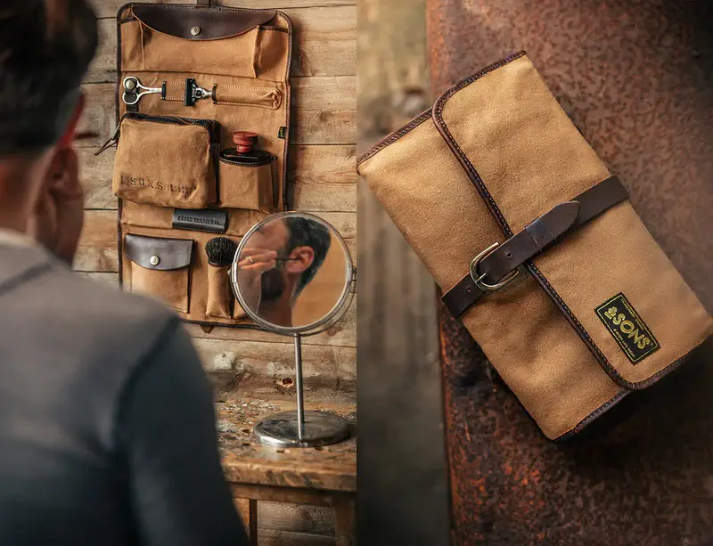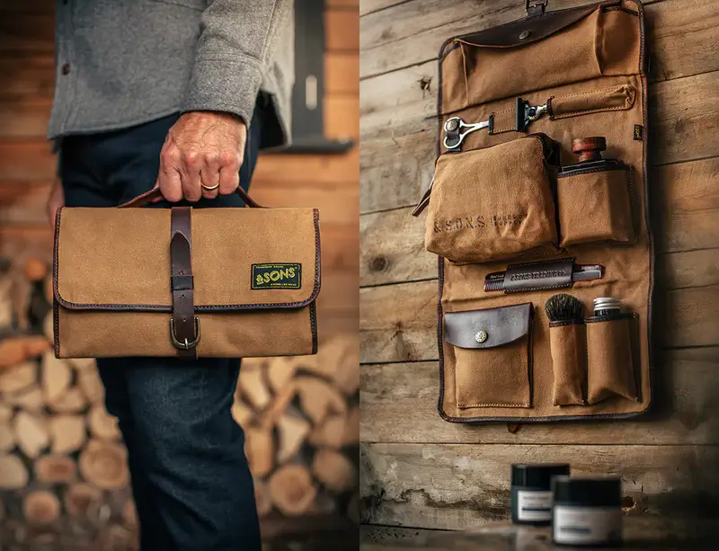 &Sons took a unique approach in designing the dopp kit with this military-inspired waxed canvas and buff oil leather travel companion that looks more like a tool roll.  But the Essentials Toilet Bag is meant to carry your overnight essentials or toiletries and keep them organized.