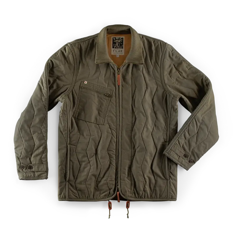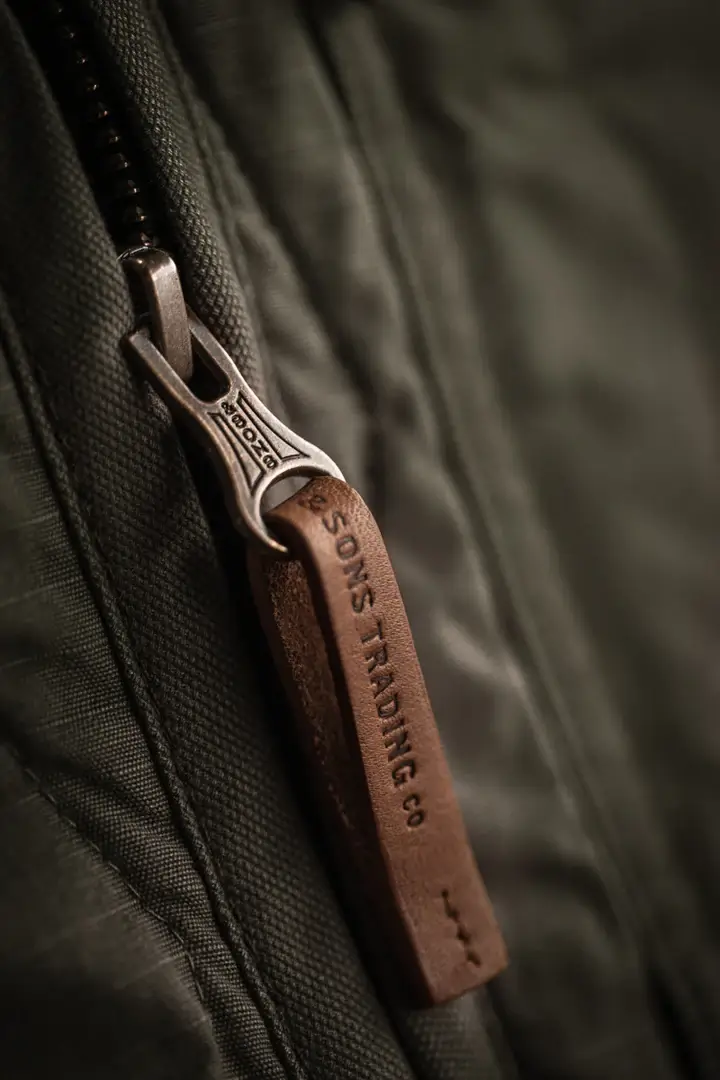 &Sons’ Flak Quilted Jacket also comes with leather pull tabs, leather adjustment on the hem, and antique brass YKK zippers for the pockets and the central closure. This is lightweight but warm clothing for your cold outdoor adventures.