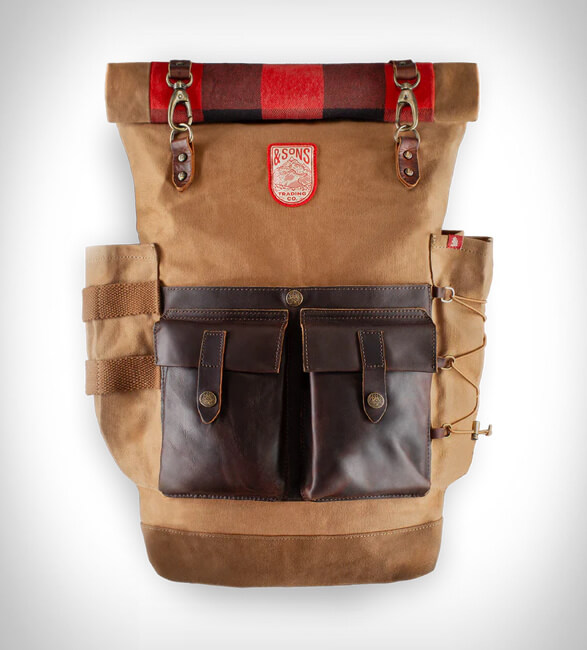 It’s crafted from 100% cotton canvas and coated with wax for added durability. It features a roll-top opening secured by a classic flannel check clip closure for quick and easy access of its contents, front leather pockets, and branded snaps. Inside, is a dedicated sleeve for a laptop with a max size of 16.5″.
